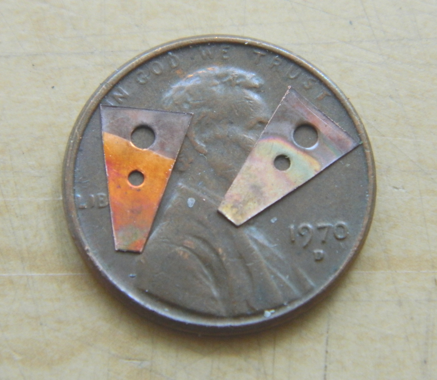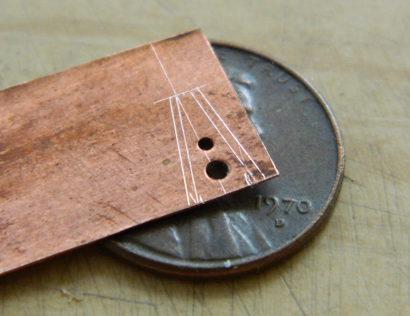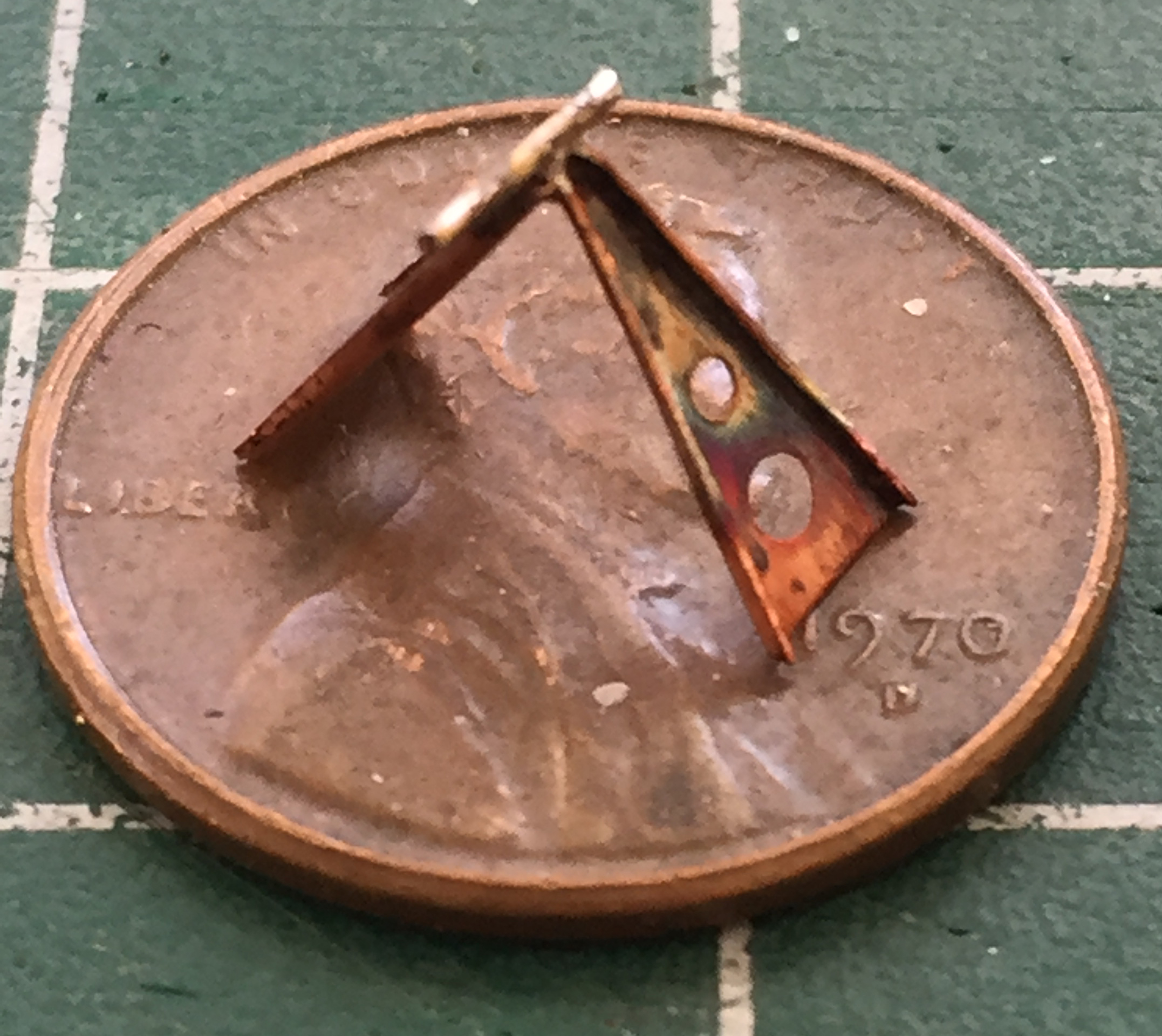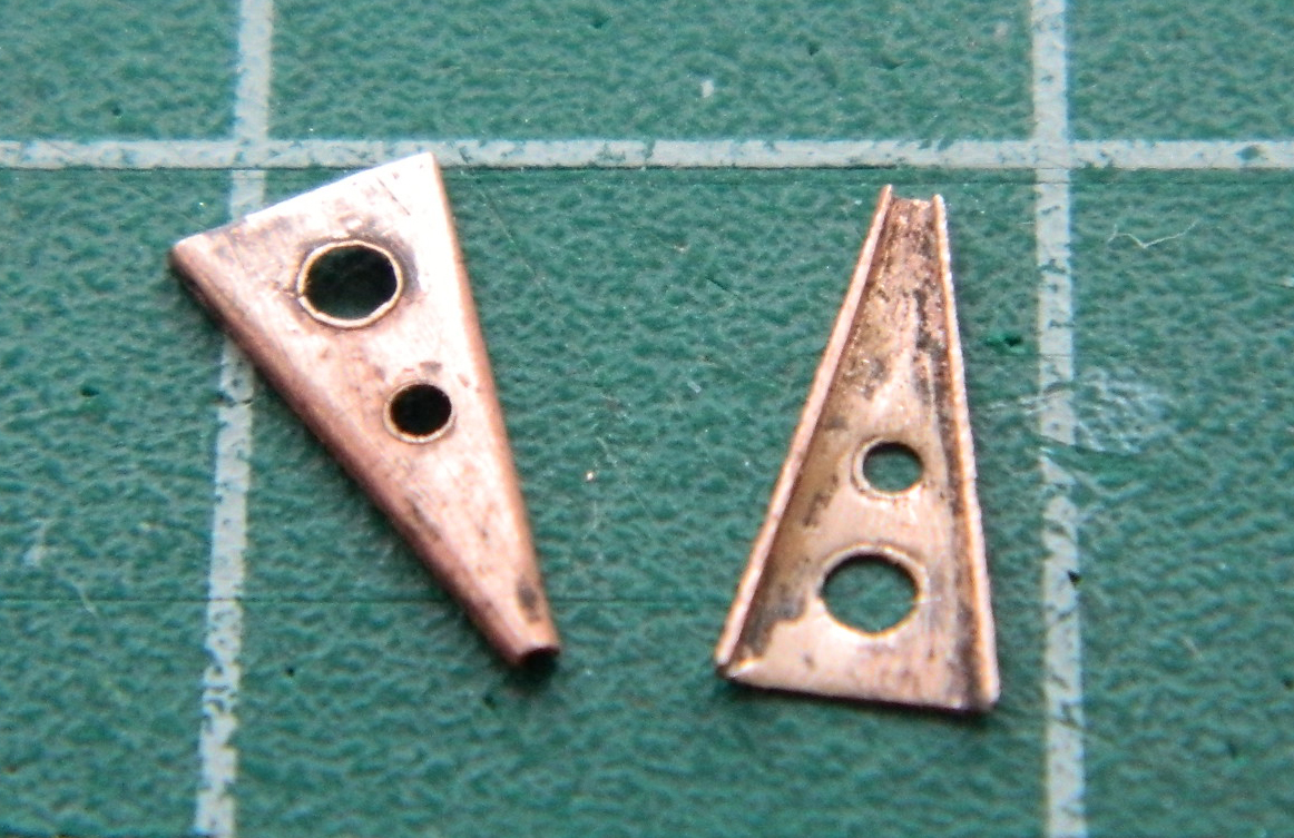 Landing gear on large aircraft is more like a very strong shock absorber and they’re called an “oleo”. They compress under load and extend when unloaded. Something has to be attached to keep the oleo from overextending and those extension limiters are triangular (generally). That’s the type used on this landing gear. I used .005″ (.127mm) copper shim stock to make them and that started by laying out their basic shape and punching two lightening holes in each part: