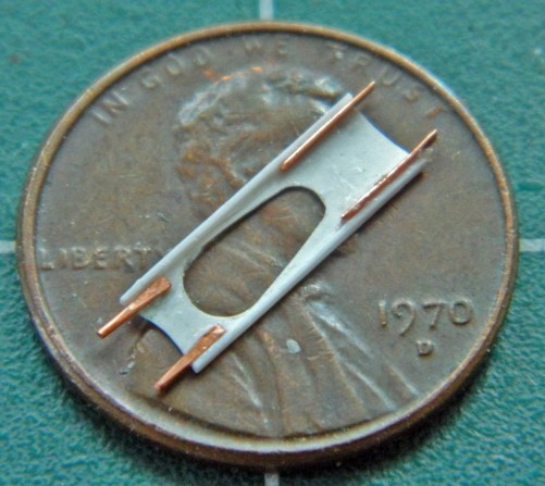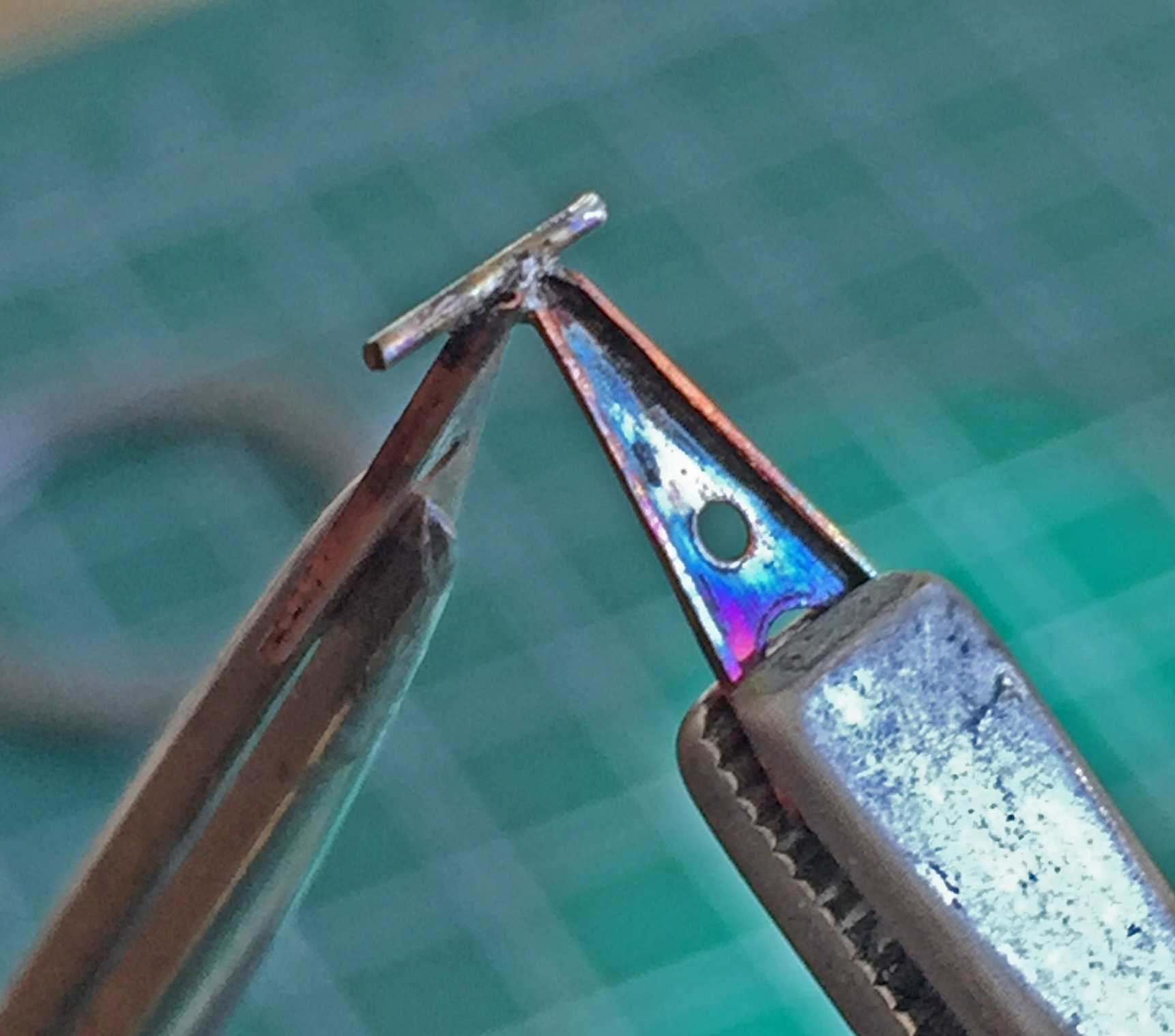 The extension limiters join at the small end. To replicate the hinge, I used a 22awg copper wire. The really interesting part of this was soldering them together. As most of the rest of the world, I only have two hands. To do this easily I would have needed at least three of them (or four, if you’re into bi-lateral symmetry) (I’m not judging). I used locking tweezers on stands to align and hold the two parts with just a little bit of overlap. This overlap created a “saddle” that I could place the wire on so that soldering it in place was at all possible. Using a butane torch would be challenging because the force of the torch’s gas flow could easily blow the wire across the workbench. To successfully solder this without causing the wire to go elsewhere, I approached the join from a fair distance away and worked the flame back and forth as I (SLOWLY) brought the flame closer. Once the flux melted, I knew I was close. Then the solder melted and I quickly moved the flame out of range. Whaddya know…it worked (I trimmed the wire to length once everything cooled):
