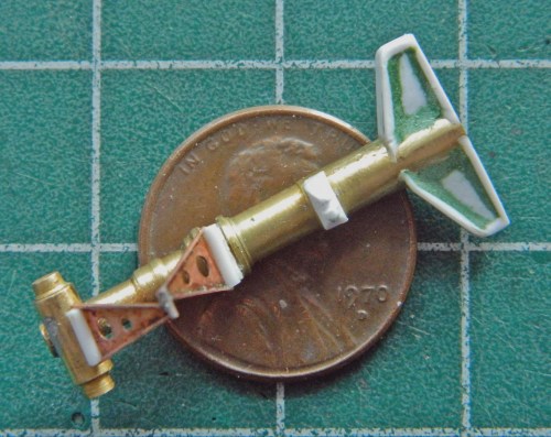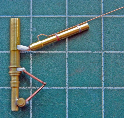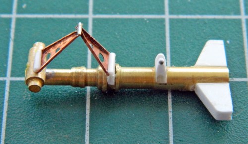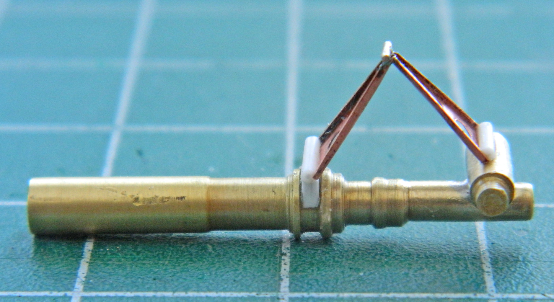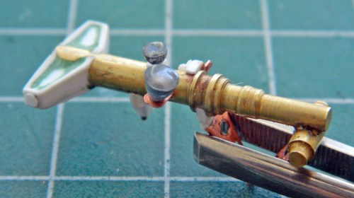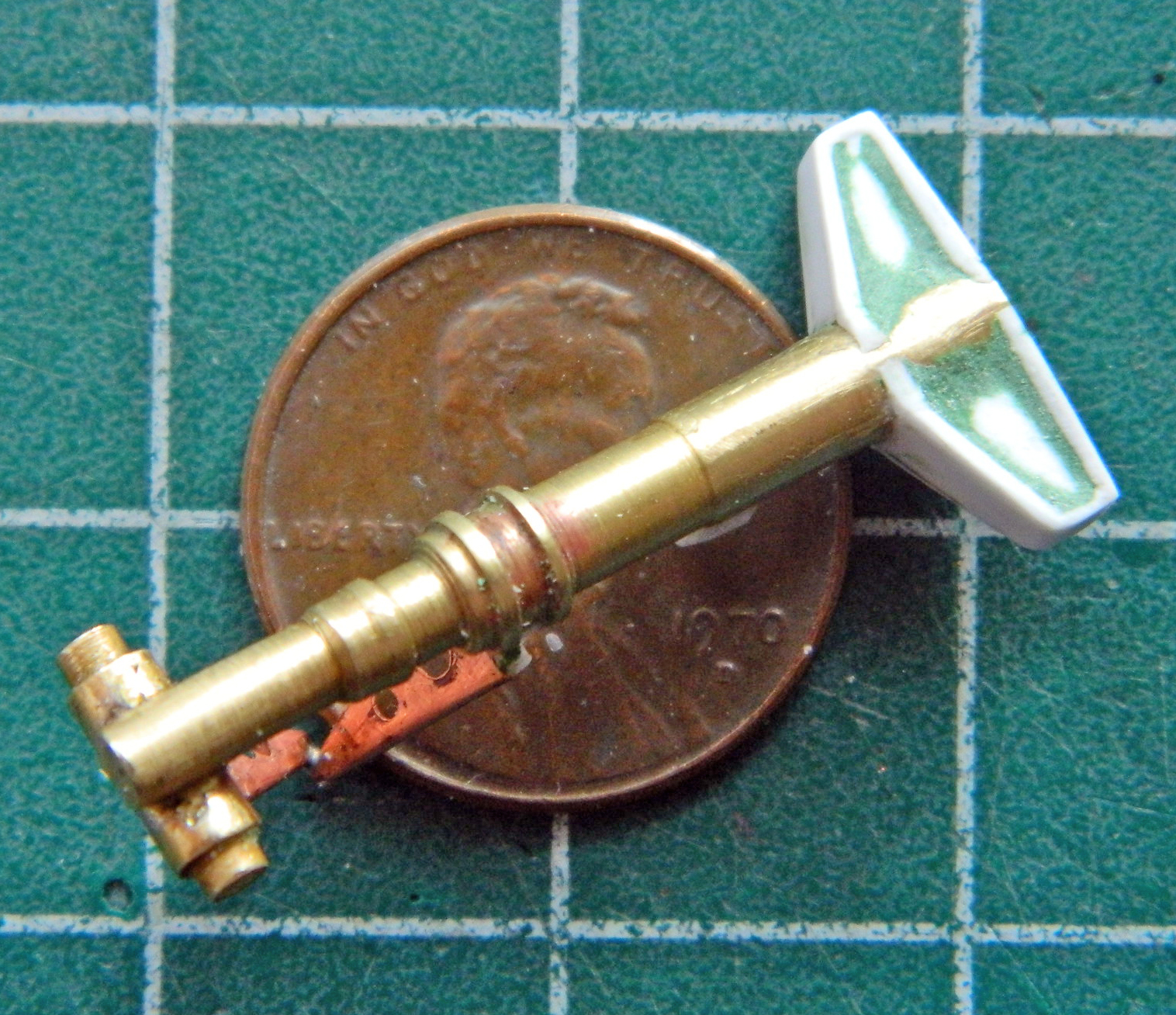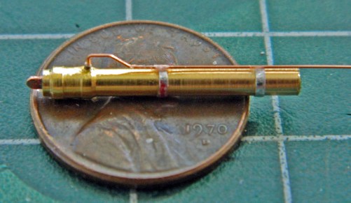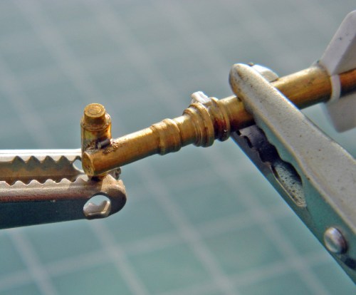 Flying if not high, at least off the ground, on my sense of accomplishment (that soldering job was very finicky and I did it successfully), I chucked a quarter-inch (6.35mm) brass rod into the lathe and turned the extension/retraction hydraulic cylinder, then added the hydraulic line. The restraining straps were made from aluminum duct tape, the line itself from 22awg wire. I amazed myself again by soldering the rounded mount at the left end of the cylinder in place (I filed the part round after soldering to ease the soldering process):