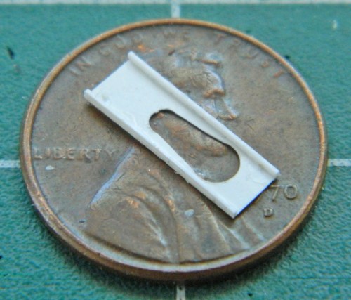 Now that I’ve shown myself that I haven’t wasted the last two weeks, I can finish the nose wheel strut by adding all the other stuff that goes there (yes…there’s more). I started by making the landing light mounts. The mount for the larger light is on the right side of the strut and was made from .005″ (.127mm) shim stock. The smaller light is mounted centrally and was made from a drilled out piece of .030″ (.762mm) scrap: