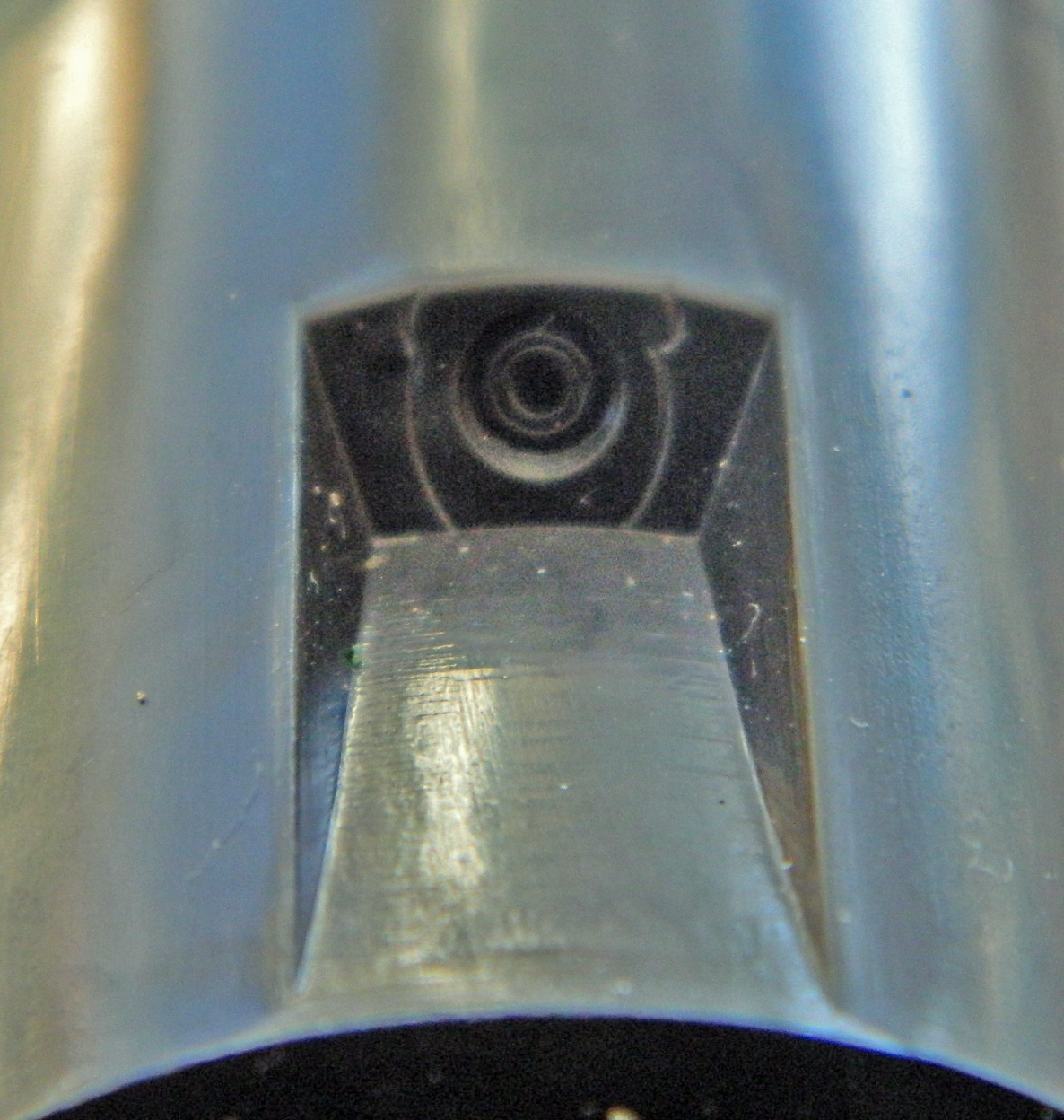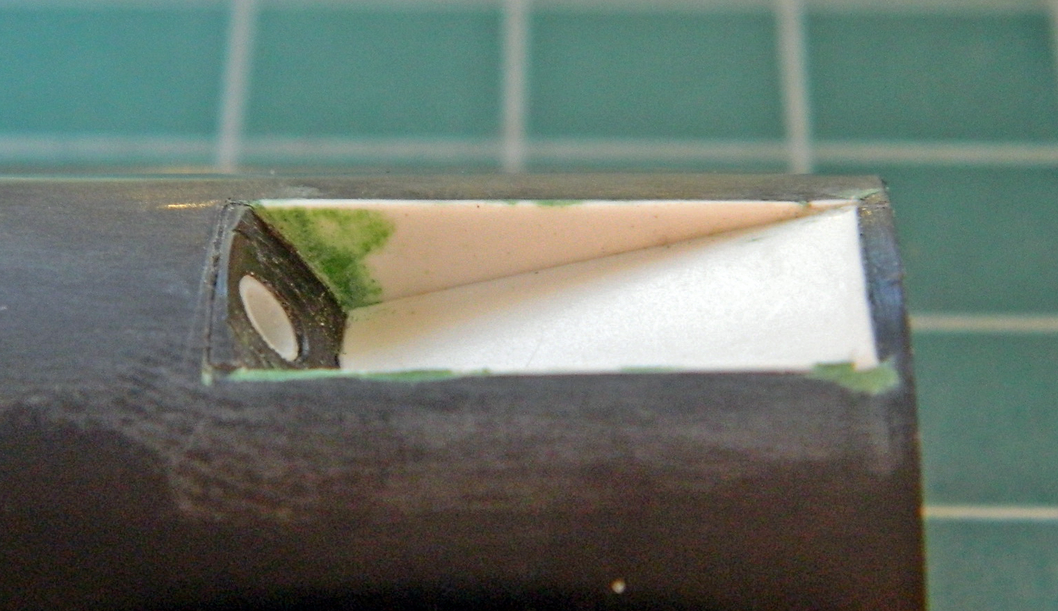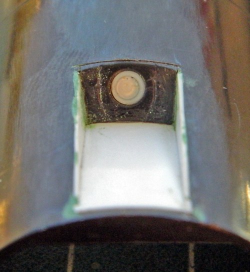 I drilled that out and widened the hole to the diameter I wanted with a rat-tail file. The closest styrene tube to that diameter was just a little bit too large in diameter and also needed to be drilled out to a correct inner diameter. I chucked it (GENTLY) into the lathe and turned it to diameter, and then drilled out the center. I cut a plug from .020″ (.508mm) styrene and inserted it into the drilled out center and glued it before gluing the whole thing into place: