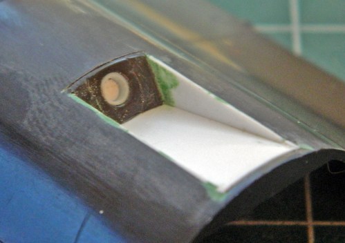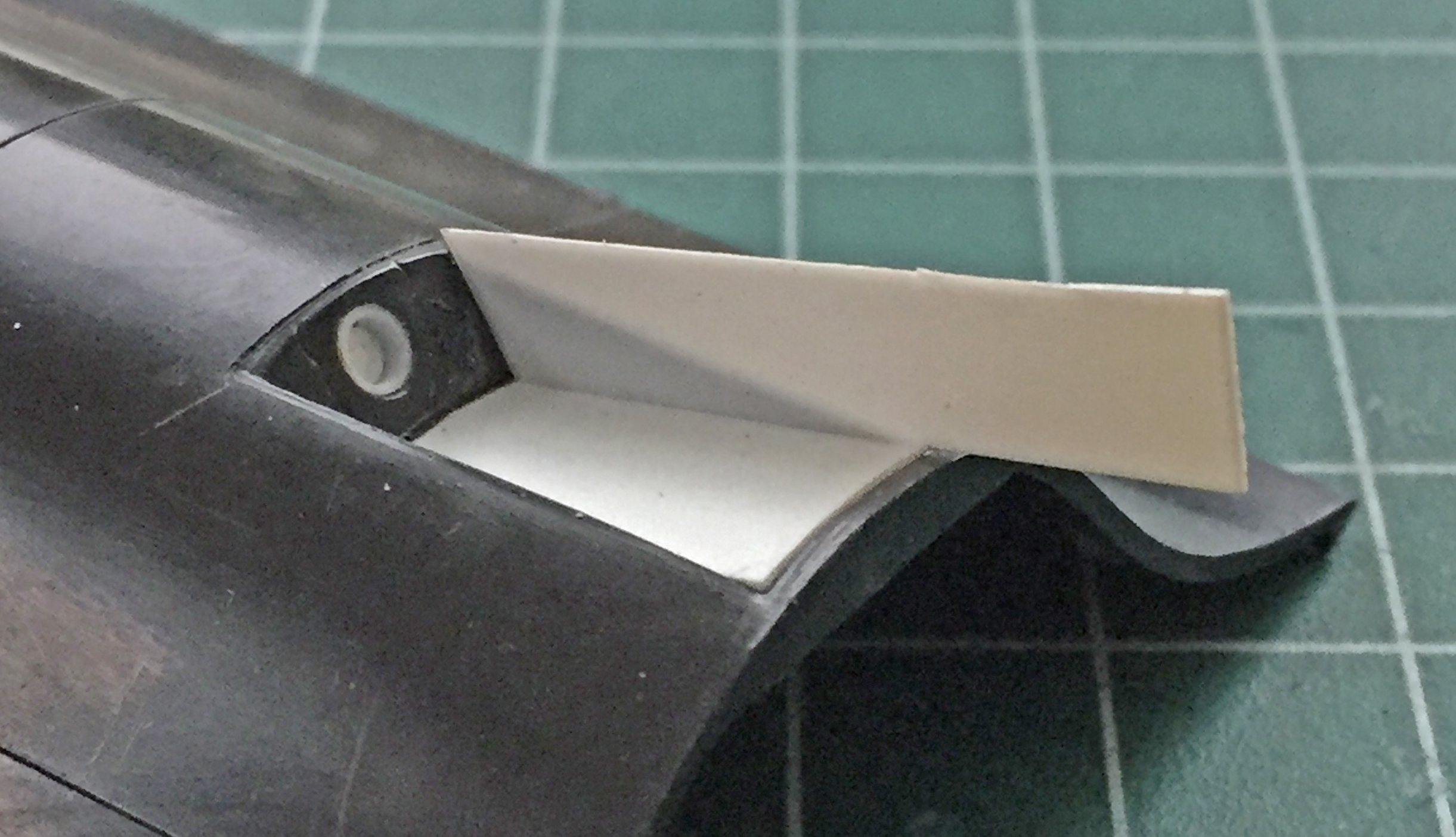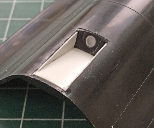 Stepping back from the landing gear construction, I fixed the errors of the mid-air refueling socket. The ramp that leads down into the fuselage is actually a hinged panel that swings up to close the port. The kit molded it incorrectly. It’s not supposed to be more narrow than the opening. The face where the refueling socket is looked correct to me, even if the socket itself wasn’t exactly a socket: