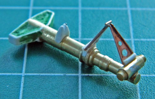 The nose wheel steering is electrically operated and as such has a housing of a particular shape. That needed to be built (I left the “handle” attached so I could manipulate this bloody small part):