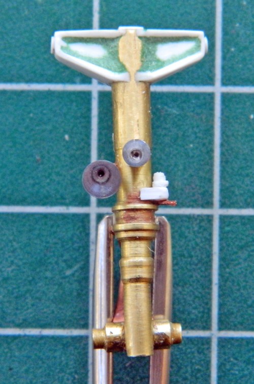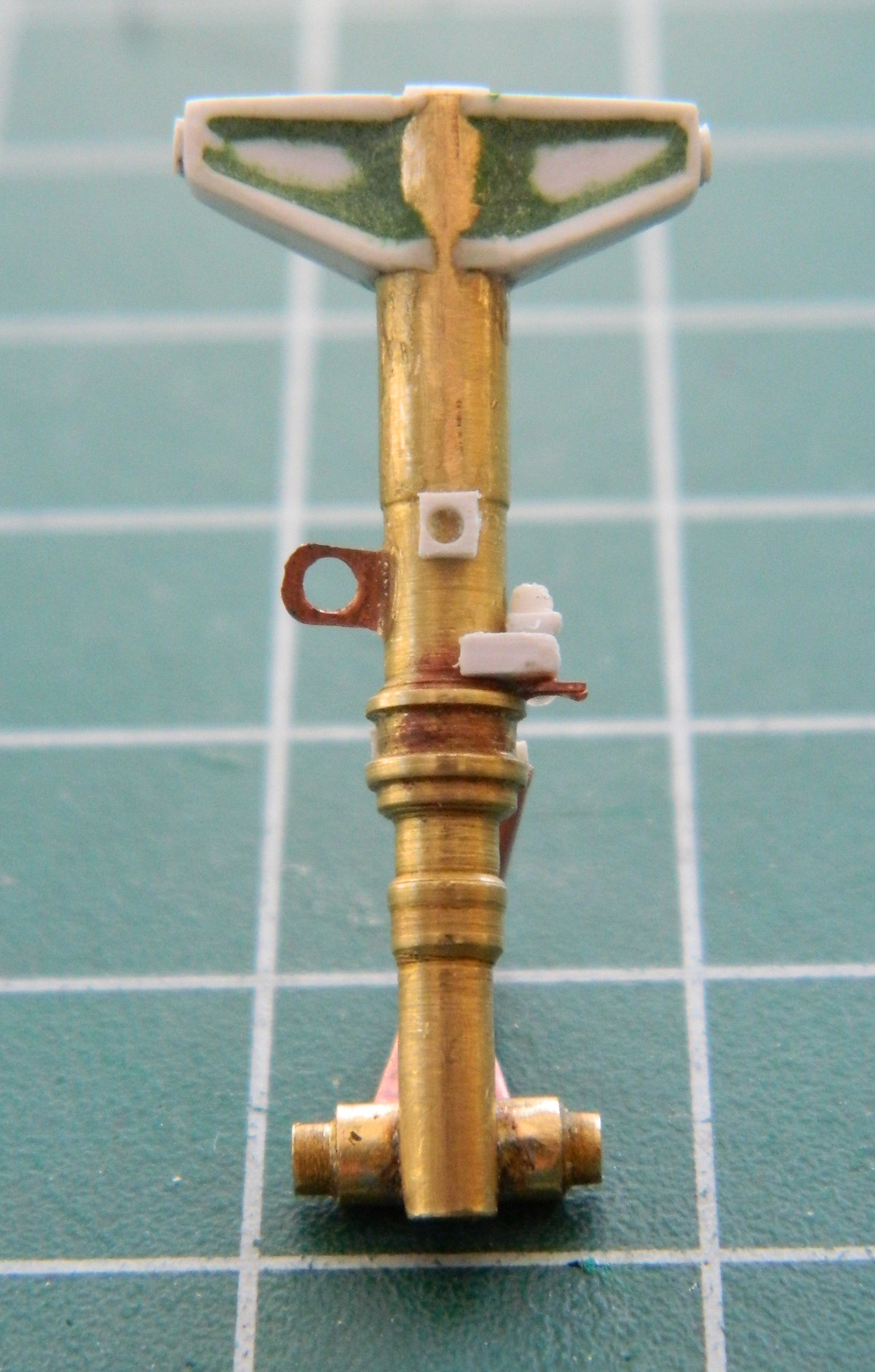 The extension limiters mount to the top and bottom sections of the front strut. I replicated that using small diameter styrene rod, superglued the rod across the wide end between the bent lips, and glued the extension limiter to the strut. (And where did that nice brass landing gear strut come from? I turned it on the lathe starting with quarter-inch [6.35mm] brass rod and without taking any photos of the process. Hopefully I don’t do that with the main landing gear struts):
