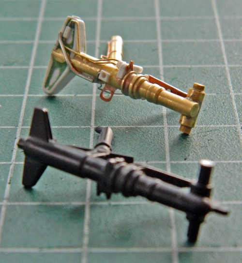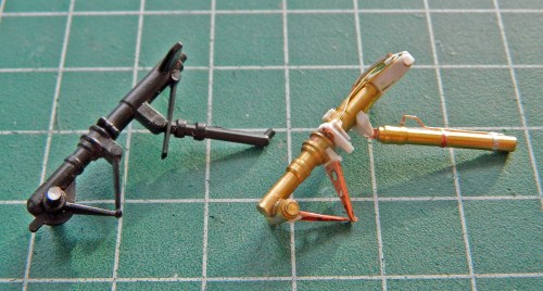 I needed to add the wiring conduit and wires. I used 22 and 24awg wires as well as .015″ (.381mm) solder and a pair of 40awg wires. Then I placed the hydraulic cylinder in place and took the next photos to show the differences between the kit part and what I cobbled together: