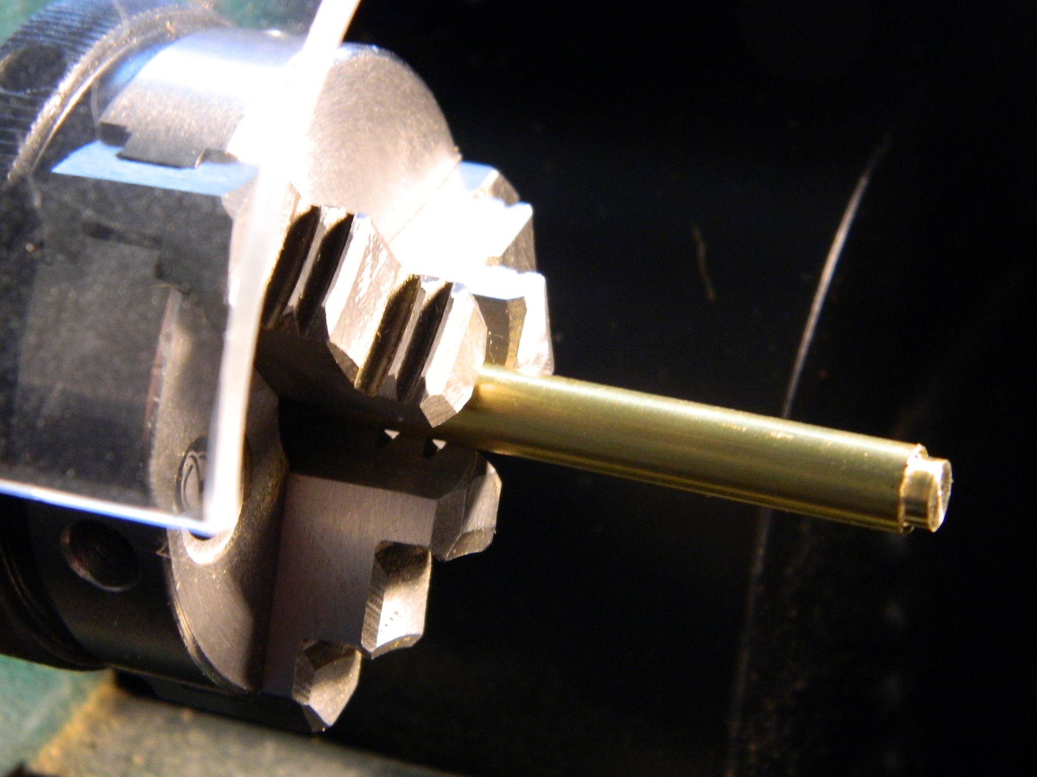 I cut a piece of quarter-inch (6.35mm) brass rod to an approximate length, leaving enough length to get the part as long as I want it and still enable the lathe’s chuck to firmly hold it without having to cut too closely to the chuck’s teeth to pose a hazard: