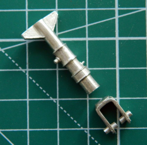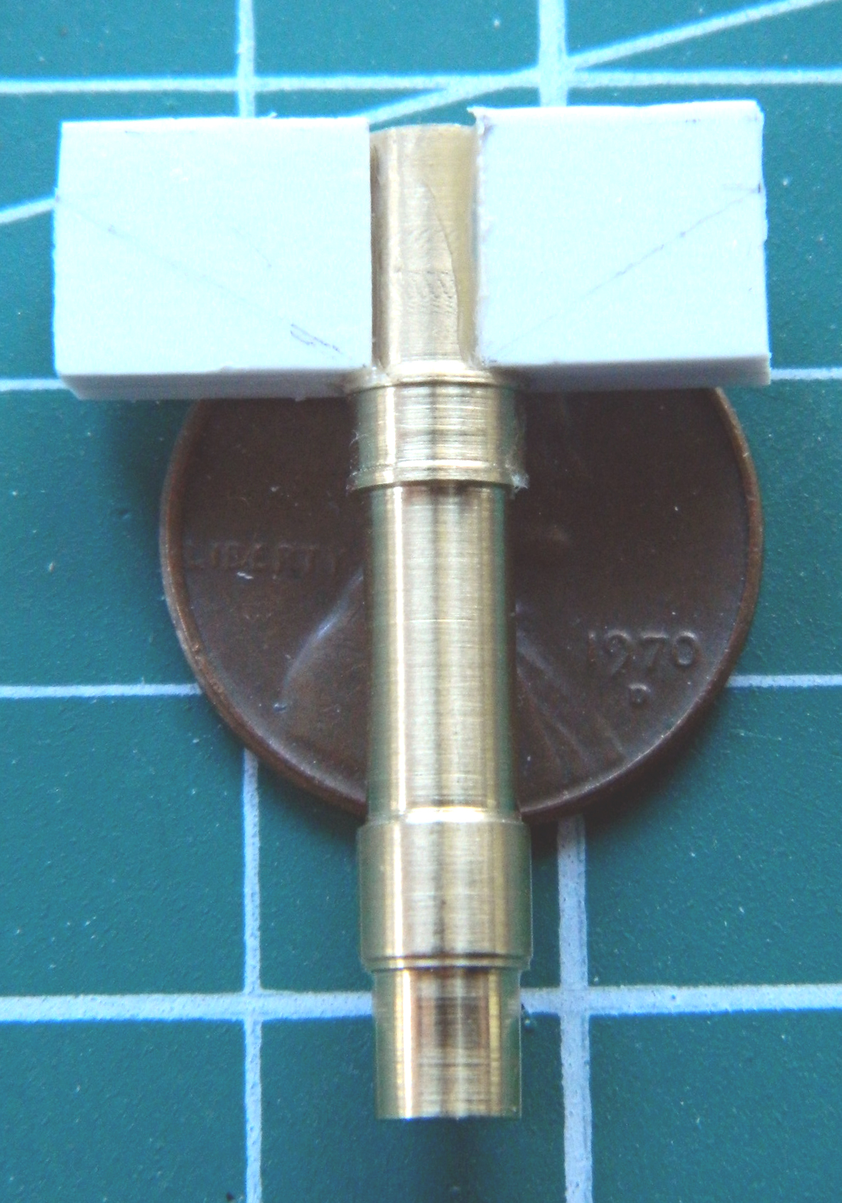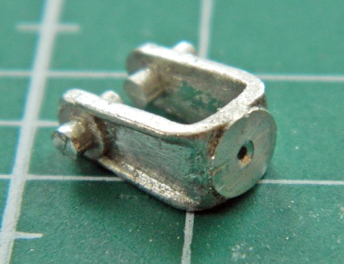 One of the things that have been nagging me is just how am I going to do the yoke where the center tire mounts? Any idea I came up with was either impractical or far too complicated. The idea I went with was the most simple (a concept that I need to keep in the forefront of my mind); cut the yoke off the SAC parts and glue it to the brass struts (that’s why I drilled the struts for pins). The nice thing about a lead-based alloy is that it can be easily cut with a razor saw (there are other benefits as you will see later):