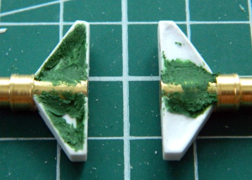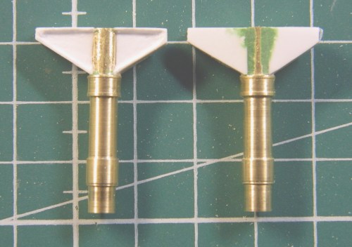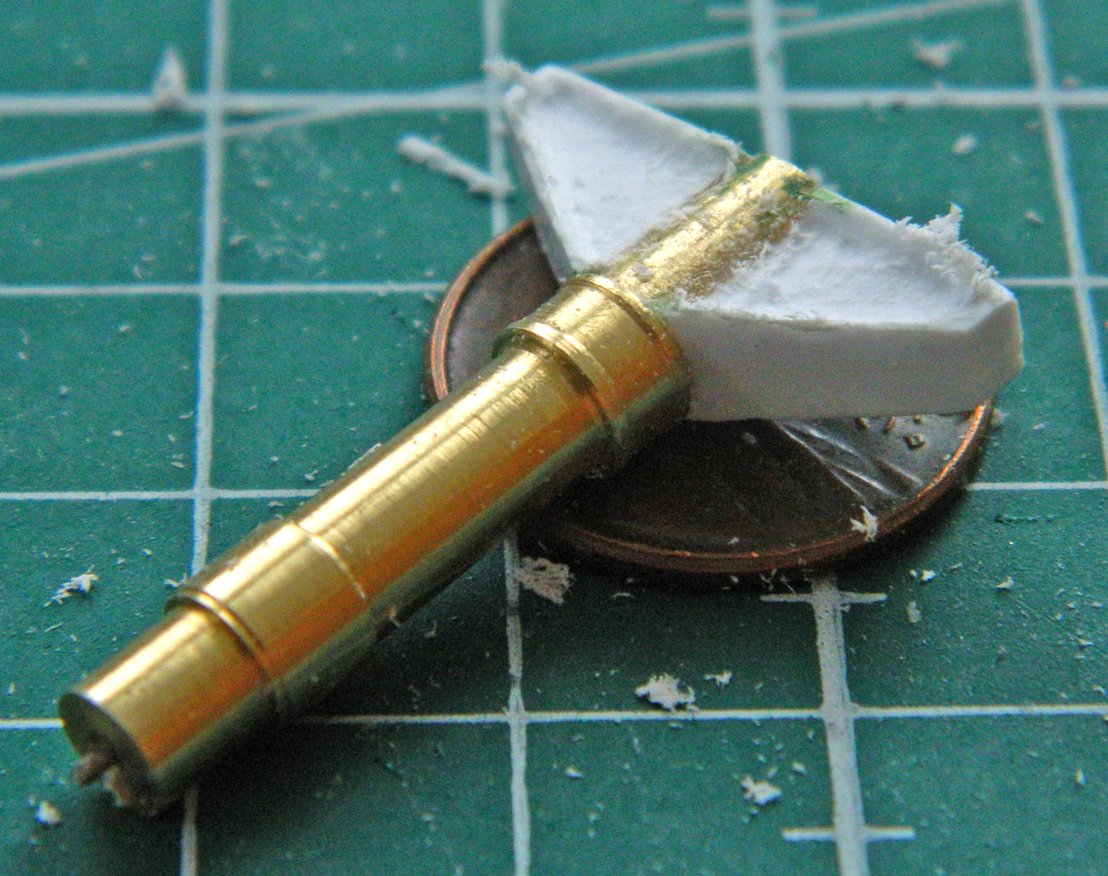 Some putty is needed to create the illusion that the top of the strut is one casting, not a part with two other parts added. I got a little carried away when I carved the one trunnion, so that got puttied while I was at it:
