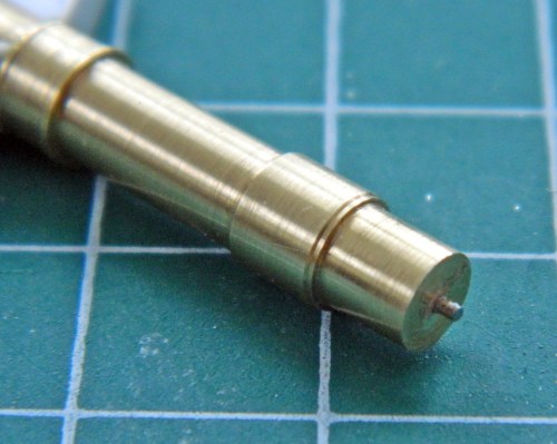 Lots of spinning and cutting as well as center-drilling the end for a pin I’ll need to install later and I ended up with this (which will be cut off at the shoulder on the left…I used the kit’s landing gear struts on all of the landing gear struts to establish the new parts’ overall length):