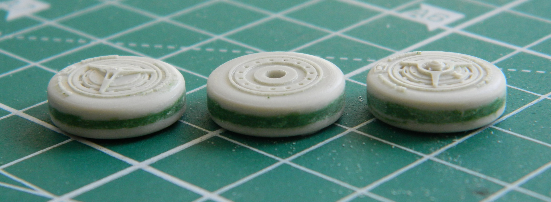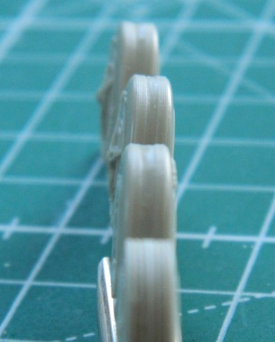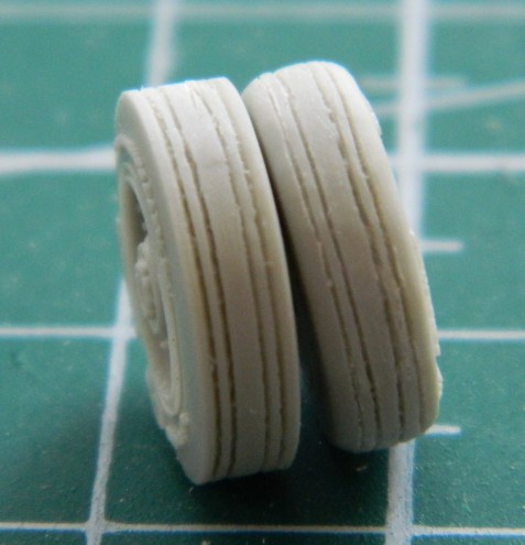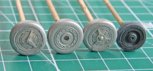 I’m using a set of resin wheels and tires from Fisher Model and Pattern (part #A-4806) for this build. The details of the hubs are far superior to the kit’s “details.” Even as nicely done as they are, they still need some attention. All of my reference photos show that the contact surfaces of the tires are smooth and don’t have the treads Fisher has modeled into the tires. The contact surfaces are also supposed to be slightly convex, not slightly concave: