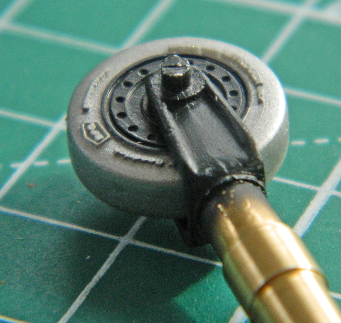 The hubs of all the tires were painted with a color-corrected coat of semi-gloss black. While I had the semi-gloss black in the airbrush, I had to check a couple of things and to do that I hit them with a coat of it. The first thing I wanted to check was how the trunnions turned out. Not quite perfect but certainly within 90-95%. I also have to spread the yokes to get them to accept the center tire (and there’s that other benefit to a lead-based part…it would bend easily). I didn’t know if I could bend them far enough without causing the paint to crack. Ideally, the acrylic paint would be flexible enough, I could get the tires in there, and I wouldn’t have to figure out how to paint the sodding yoke with the tires in place. Luck was with me and it worked: