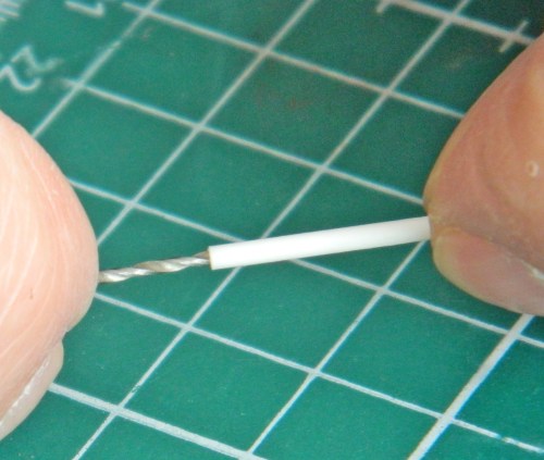With the cross brace done, I needed to make the hydraulic cylinders. However, in order to make them to the correct length, I found myself far too short of hands. I had to brace the landing gear strut in place, and I had to hold the cross brace in position, and I had to align the cylinder. Right… Since I couldn’t think of a way to do all that with only the usual quantity of hands, I decided to make the cylinders so that I could adjust their lengths later when the landing gear was permanently attached, just the way I did for the hydraulic cylinders used with the canopies. That started by drilling out the plastic rod being used as the body of the cylinder to the diameter of the plastic rod being used as the ram: