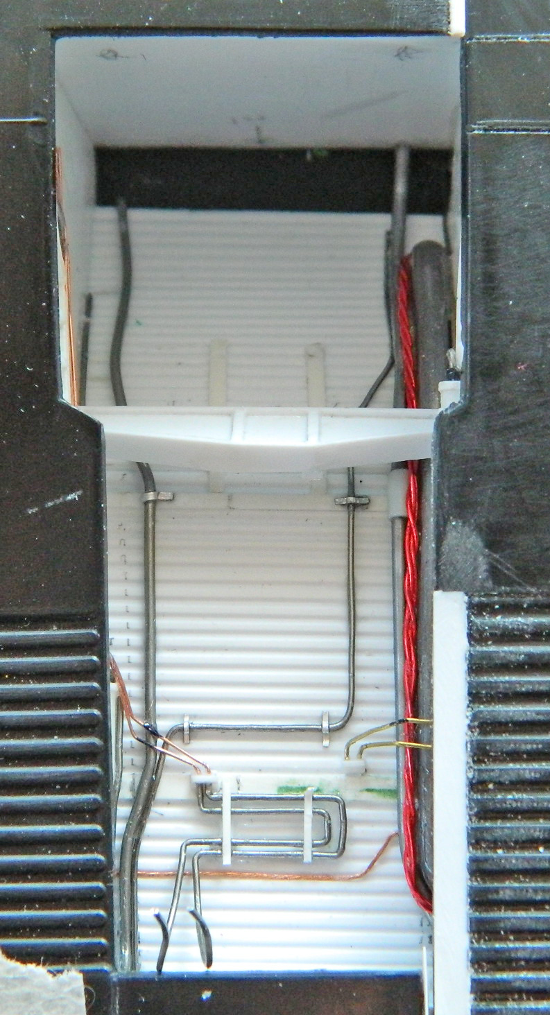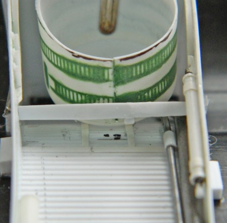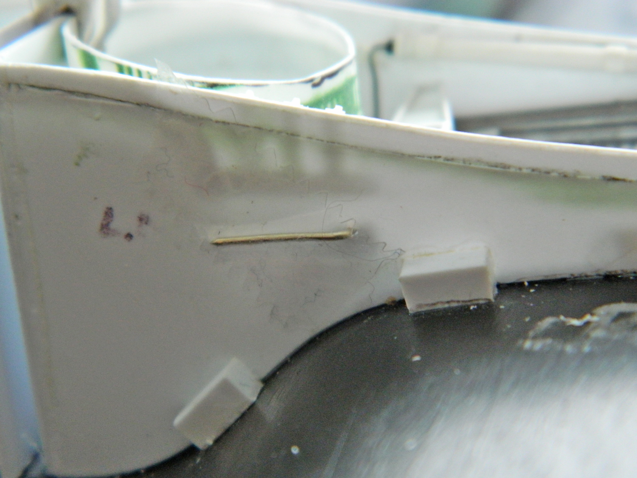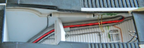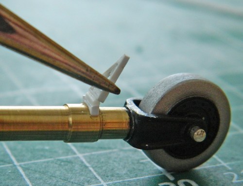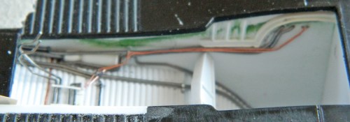 I started adding the various lines and as I was doing so, I realized that I was going to need to mount the cross brace about now because care would be needed so that I didn’t put things in that would prevent me from putting the cross brace where it should be. But I couldn’t do that because I only have two hands. What I needed was some way to mount the cross braces temporarily, but allow them to swivel so that they can be aligned relative to the angle (and length) the hydraulic cylinders need. My way around that particular problem was to hold the cross braces in position, drill through the side of the landing gear bay and the end of the cross brace, and that would allow me to put a pin (or wire…this isn’t that large) in there to hold the cross braces in place and allow them to swivel so that later on I can add the hydraulic cylinders with the alignment I want (and, hopefully, that’s correct). Once it was drilled and the wire pins in place, I used tape to keep the wires from falling out: