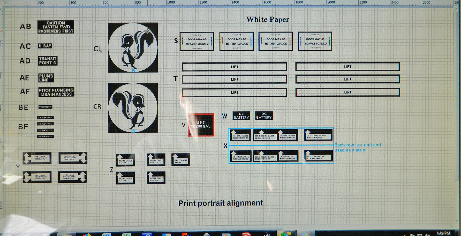 And a word about white ink. My printer (and most, excluding Alp) doesn’t print white ink, lazy git that it is thinks (because don’t all inanimate objects think?!) that white paper is enough when white is needed. Yeah, not this time. So when white ink is needed, I have to use white decal paper. I had to cut and paste the decals that need to be white into a separate file, and then surround the white part (after editing the hell out of them) with a contrasting color (black, in this case, since that’s going to be the color of the fuselage*) so I can see the sodding things: