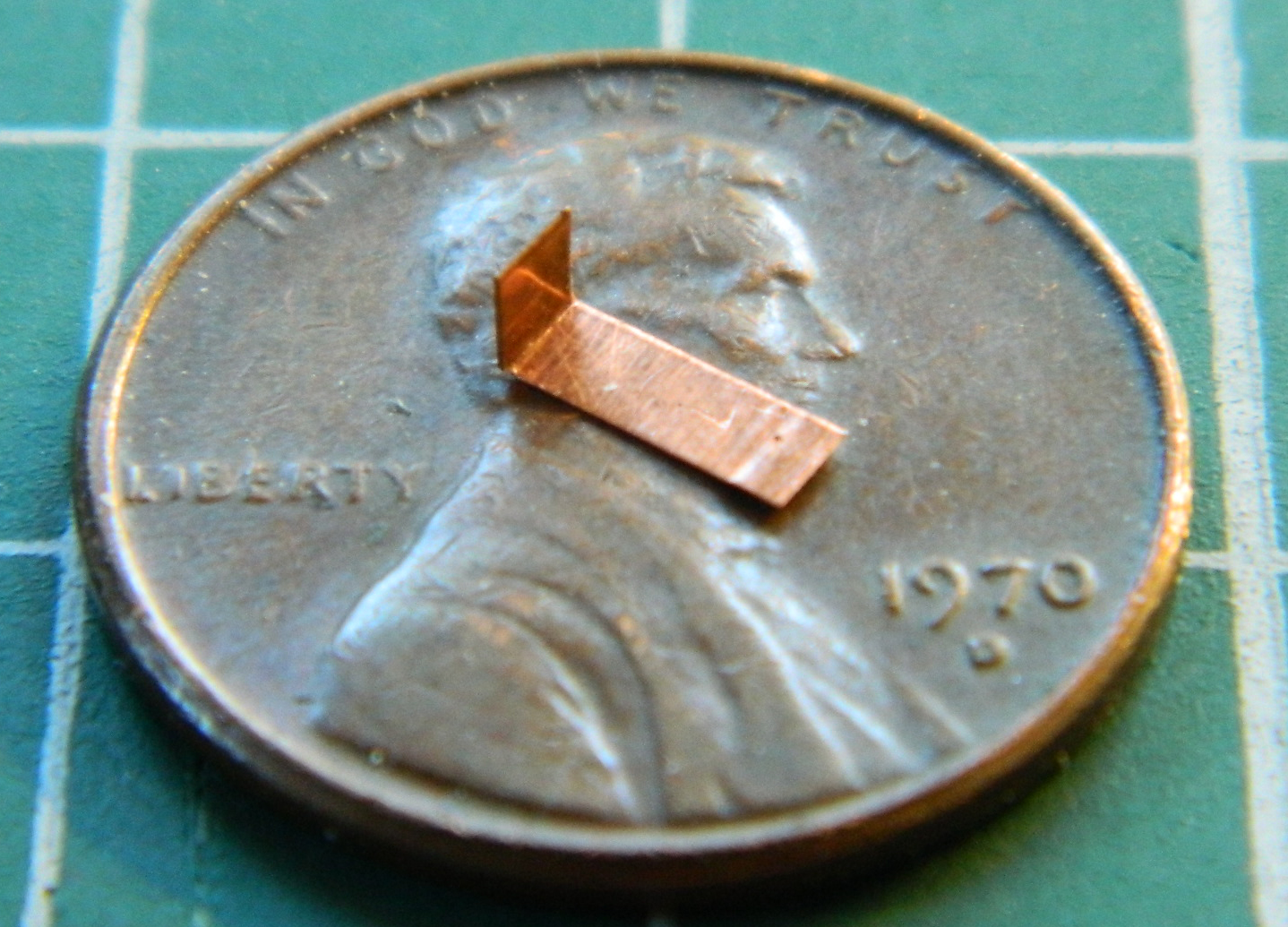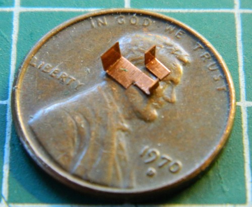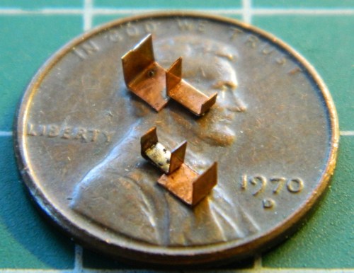 Having constructed the basic landing gear, it’s time to detail them. The first part of that was to make a bracket for Mystery Bits to attach to and I went to .005″ (.127mm) copper shim stock for that, cut out both pieces, and soldered them together into one bracket: