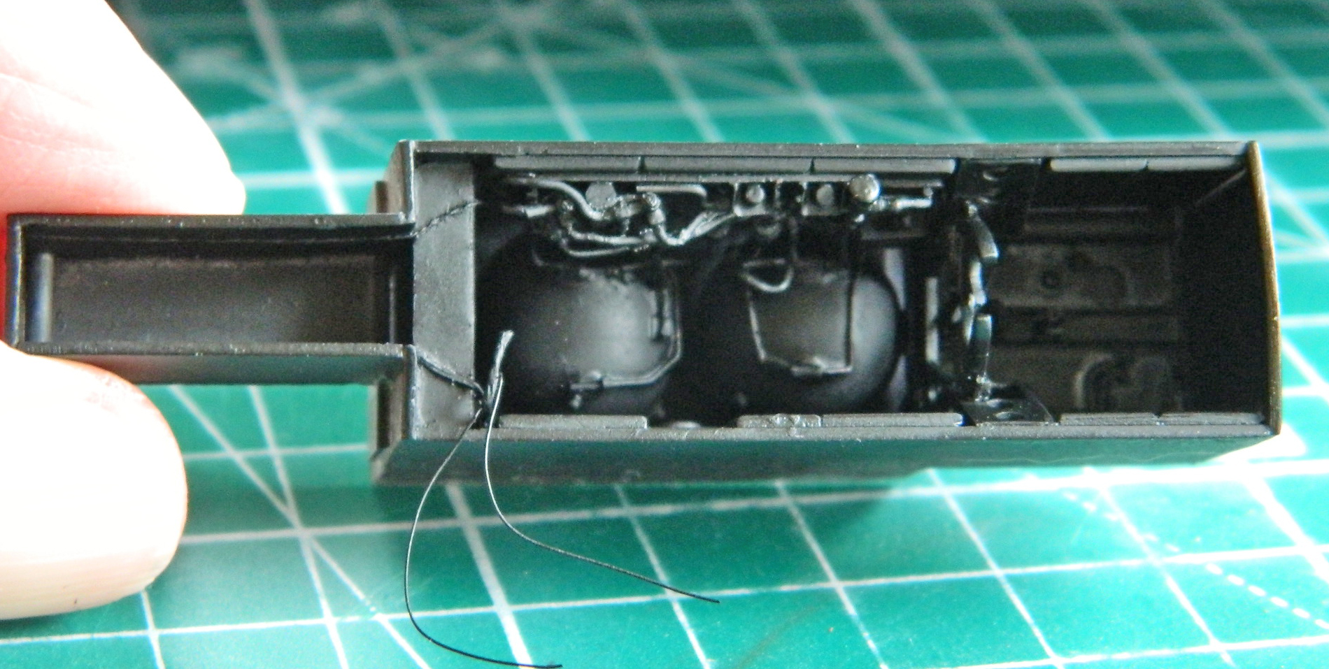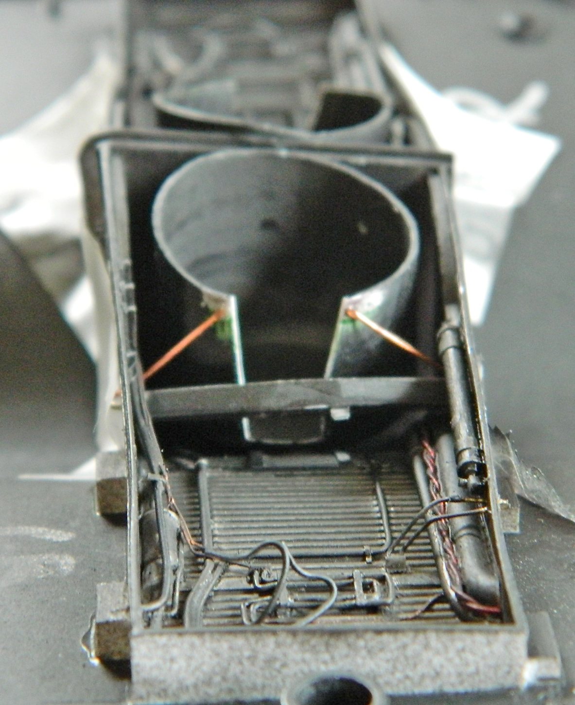 I don’t know why these lines are coiled, I just know that they are and they are visible, so, the coils get added to the bracket (I used solder for ease of manipulation) and the bracket as well as a junction block on the left side get added to the trunnion wings: