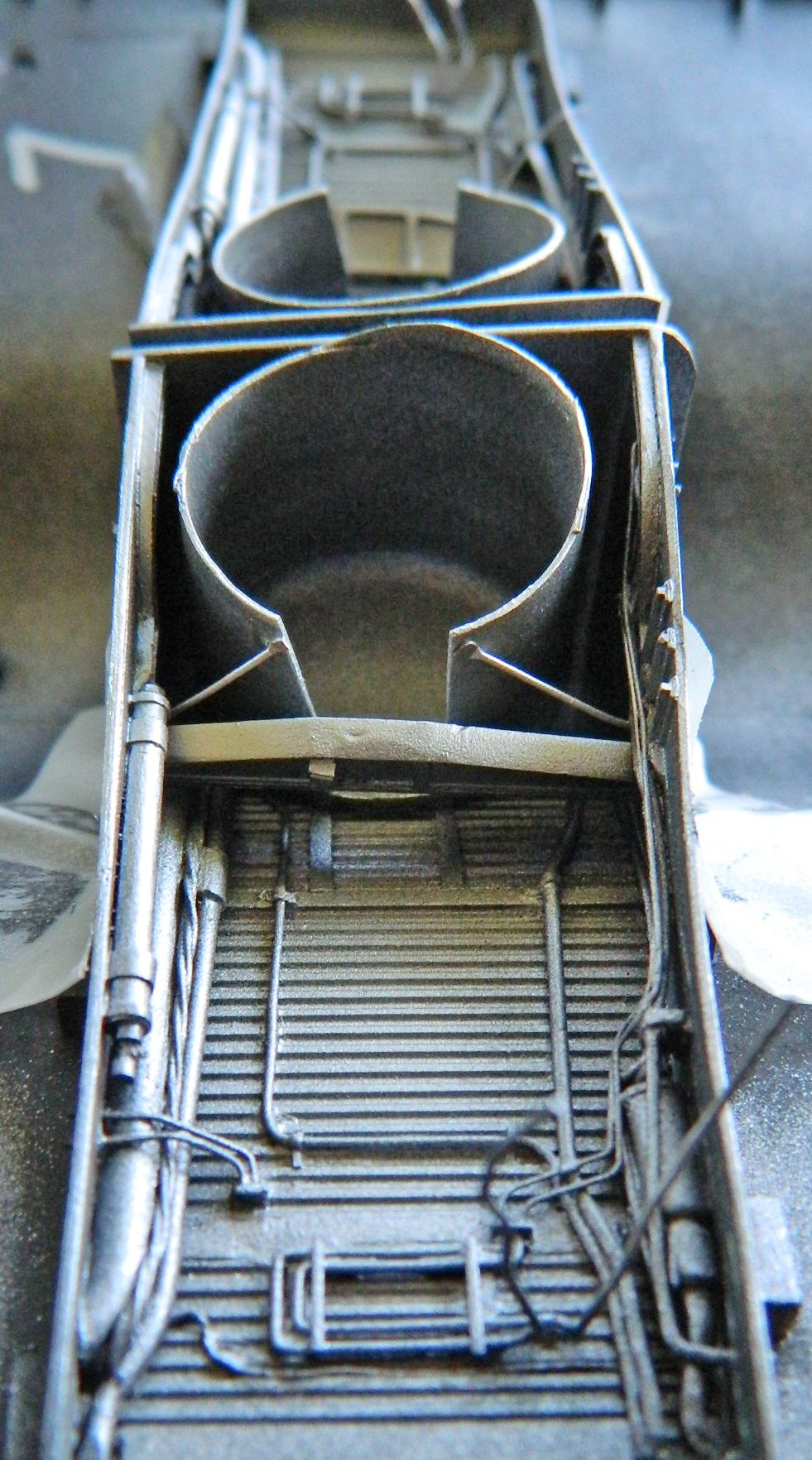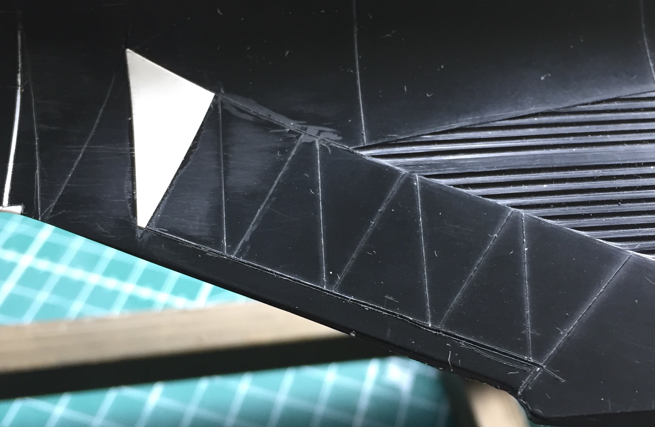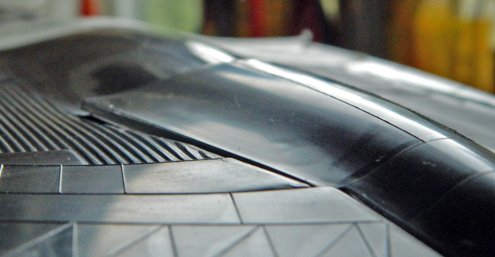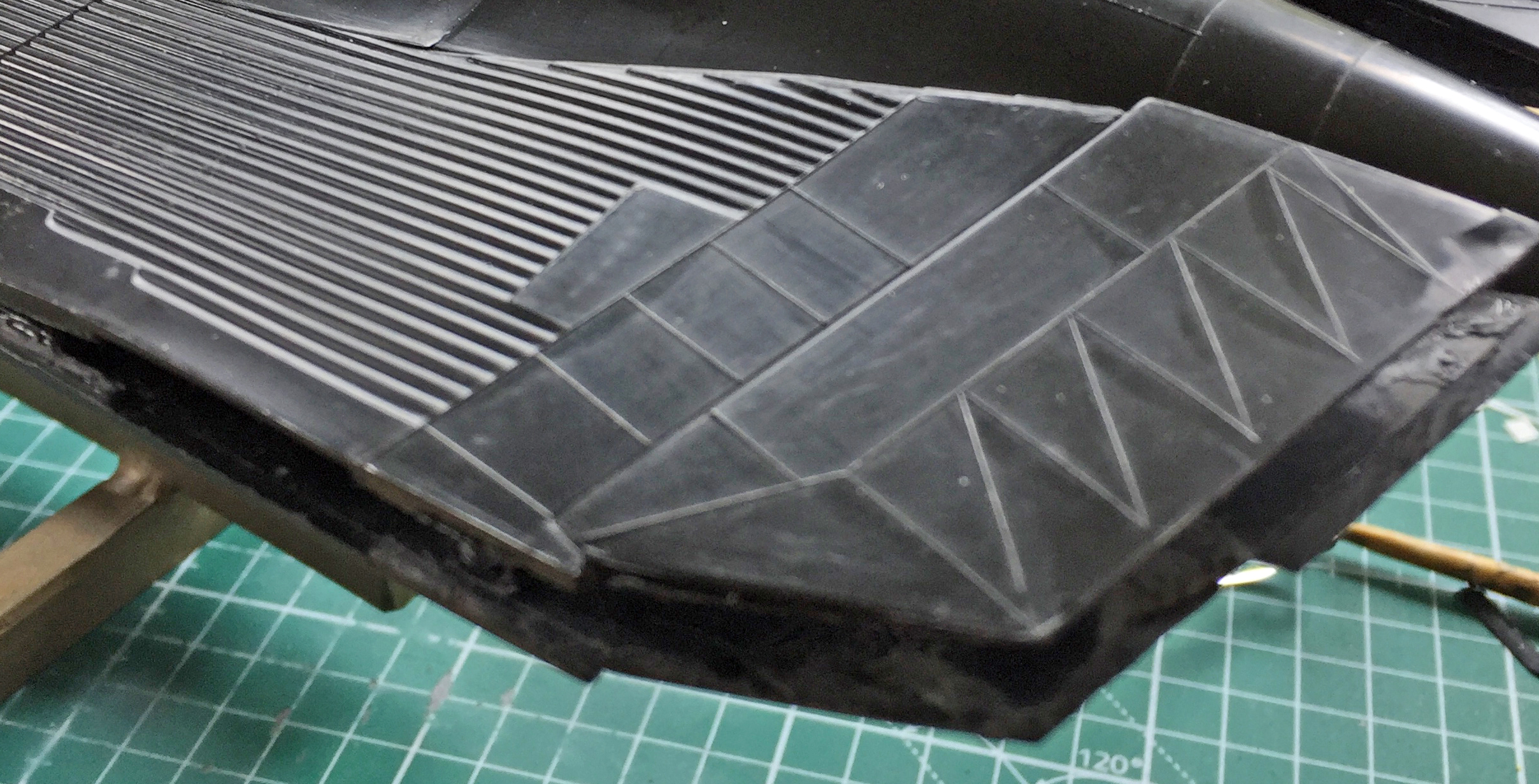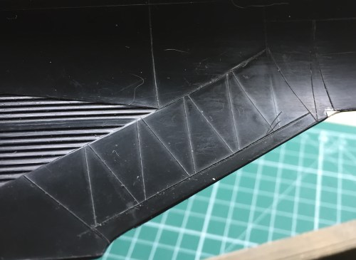 There are more .005″ (.127mm) plastic panels to add, more fit problems to fix, panel lines to be scribed, and no shortage of work left. This is the underside with that gaping hole cleverly (and laboriously) filled and some of the panel lines scribed: