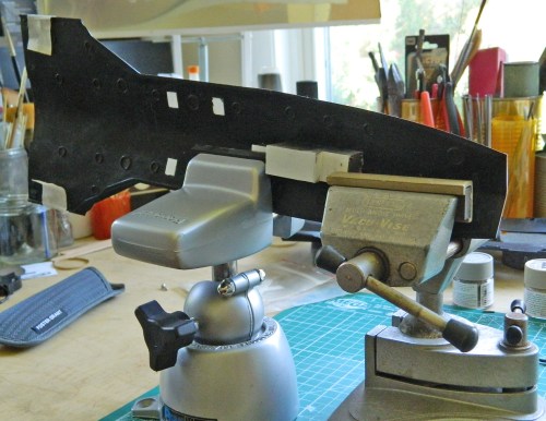 Okay, I liked how that came out, now to attach the nose gear bay. Since this model has some heft to it, I wanted to be certain I had enough surface area to support things. The first step was to get the bay in place. The vise on the right is supplying pressure to get a good bond in an area that wasn’t really fitting all that well (and there really wasn’t enough material left there to diddle around with):