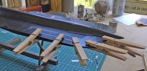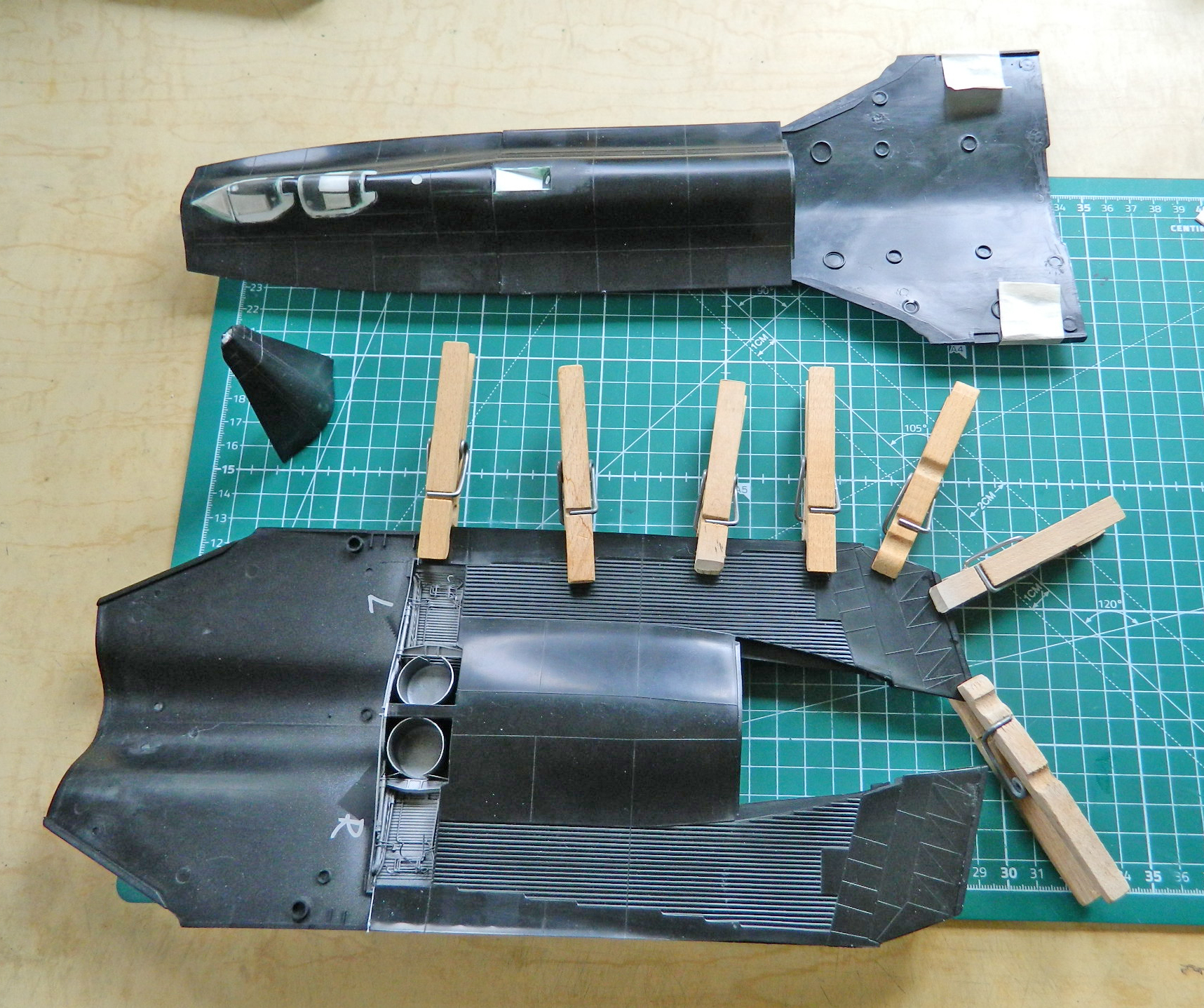 That required me to hold the upper and lower fuselage sections apart while the glue set up enough for me to release it: