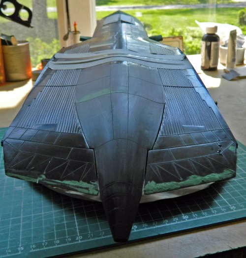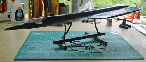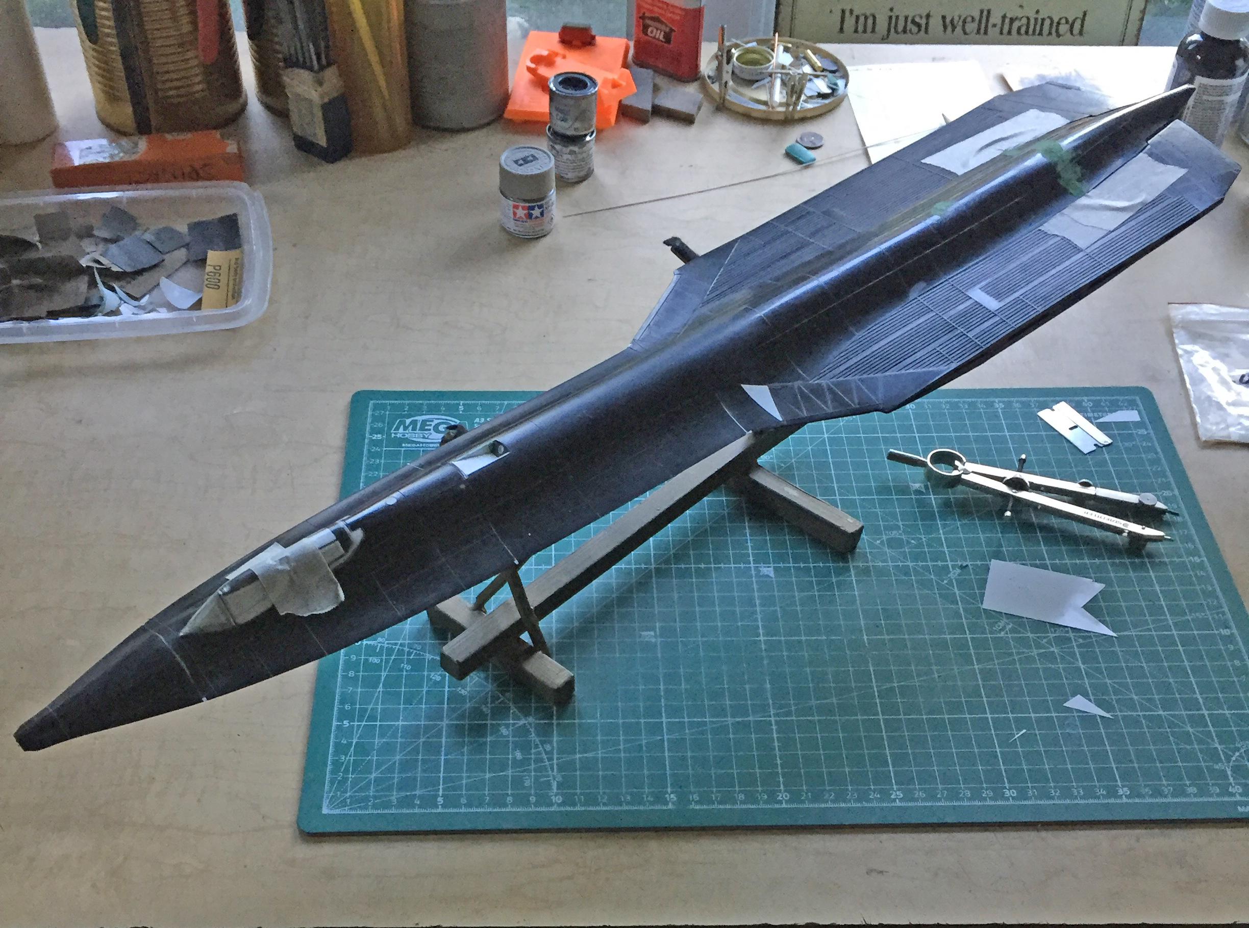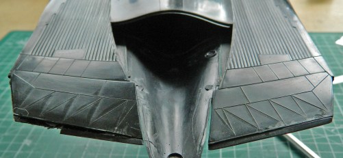 If you look at the lower left corner of the photo above, you’ll see there’s a section missing from the edge of what is the elevon (yes, that’s actually a word…it’s the combination of an elevator and an aileron). That’s because I split the fuselage parts aft of the main landing gear bays. The fuselage part that doesn’t fit was added to the underside (mostly because that’s where it’s supposed to go), the glue allowed to set up for a couple of days (because there’s going to be SOME FORCE applied here, dammit), and once I was satisfied that the part was as bonded as I could make it, I started bending things a bit (as well as more than a bit) (and in one place a lot), until things actually lined up.