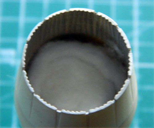 With the afterburners painted and assembled, I wanted to keep paint from infiltrating the interior. I stuffed a cotton ball into the interior and taped over the ends: