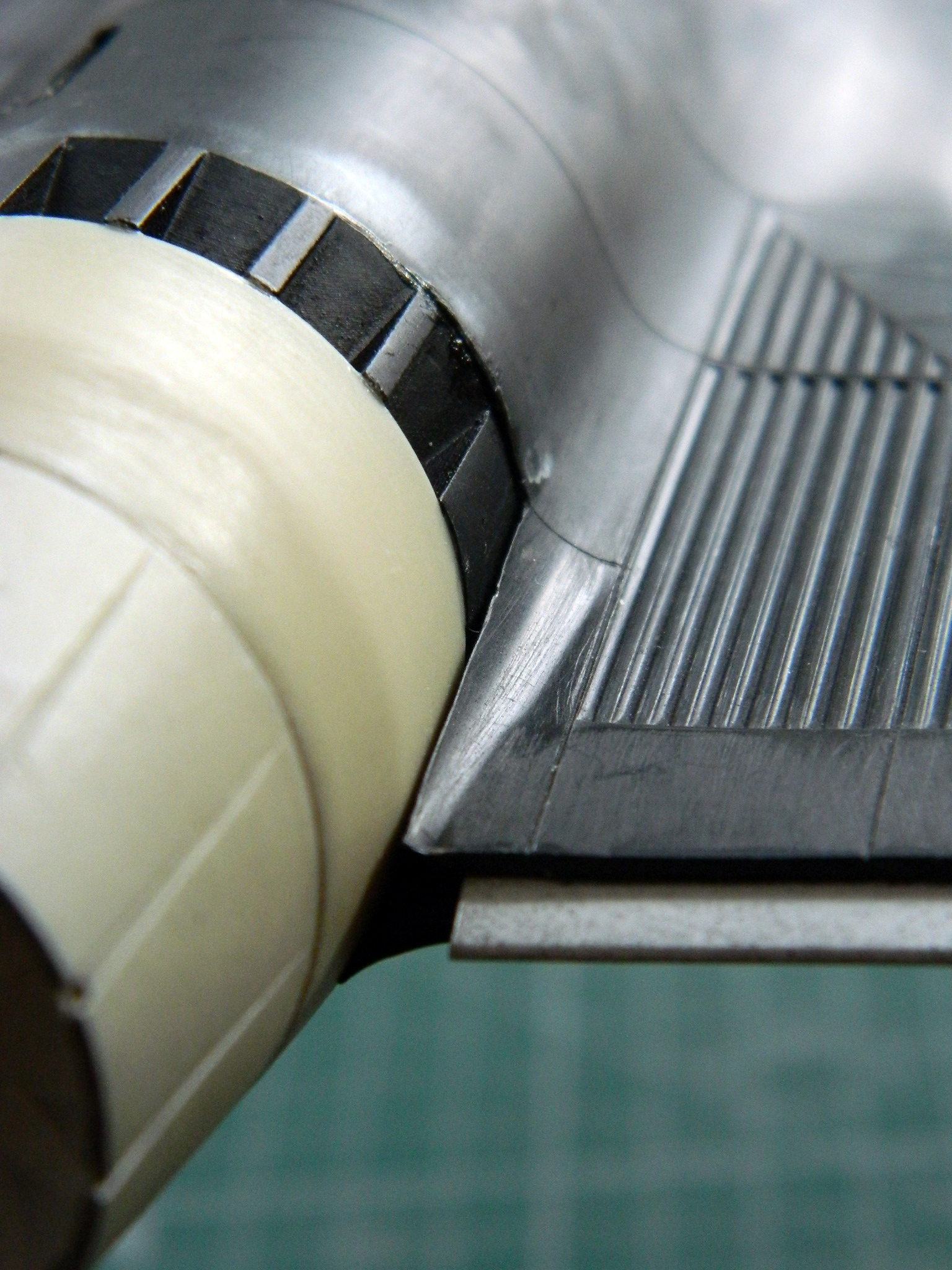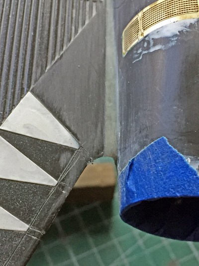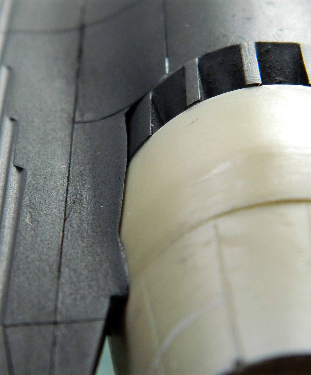 I used epoxy putty for its strength and additional adhesive properties to hold the nacelles securely in place. I laid down masking tape to keep the epoxy putty from going places I’d rather it did not and ran a strip of tape around the edges of the fragile resin intakes to protect them from nicks: