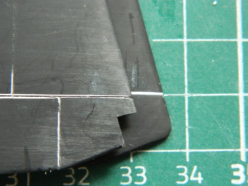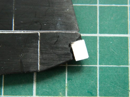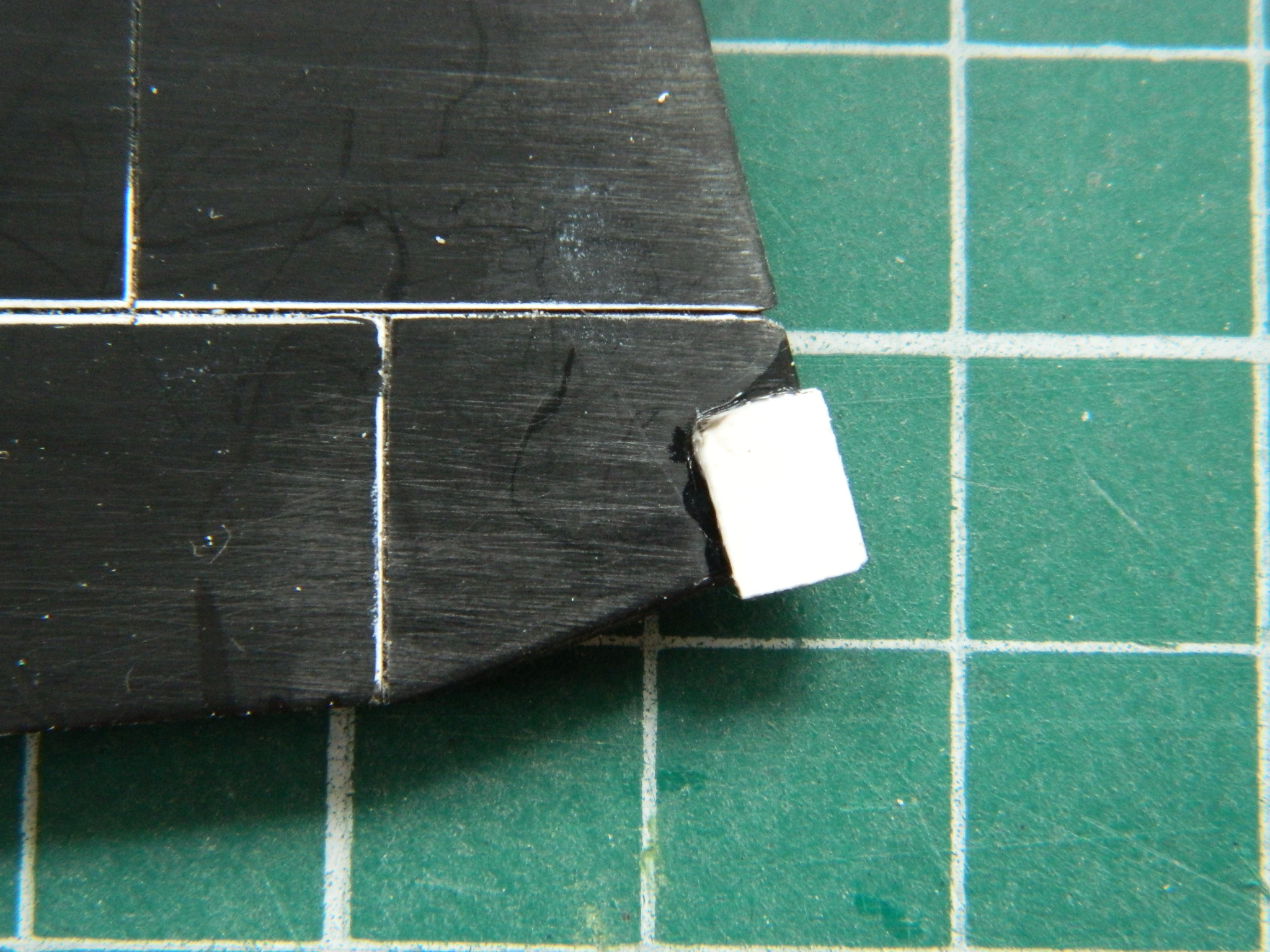While fitting, filling, and sanding the vertical stabilizers/rudders, I noticed that three of the four corners of each part were not as sharp as reference photos show them to be; the corners each had a radius that shouldn’t be there, the corner should be sharp. I cut all the corners away (for uniformity) and .060″ (1.524mm) styrene blocks were added: