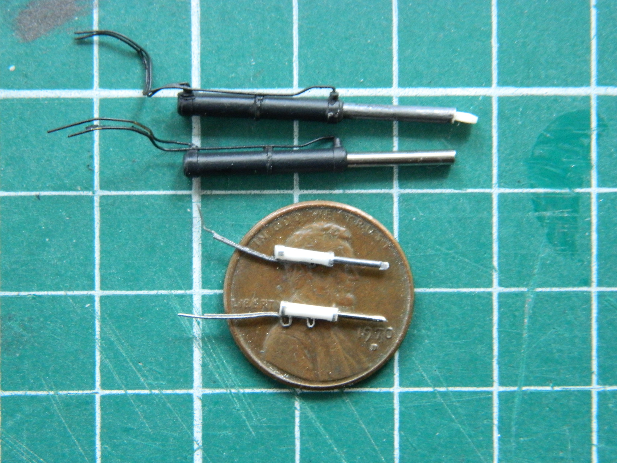 When possible, if I have to replicate a steel part, I try to use steel instead of steel-painted plastic. The difference is evident. The upper parts are the steel-painted plastic, its lower counterpart is steel. The large cylinders are landing gear parts (using steel welding rod), the smaller ones on the penny are for the canopies (using straight pins):