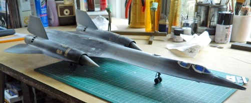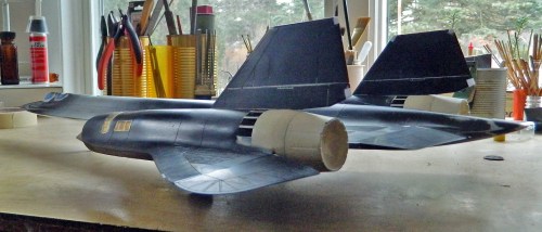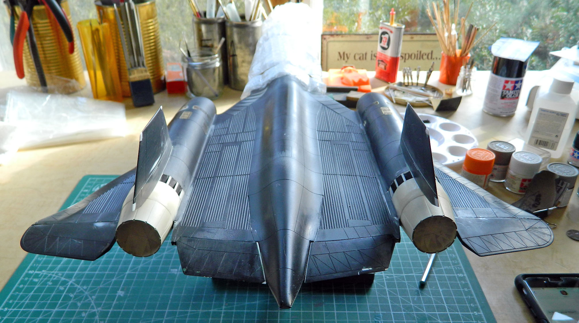 I was wroth and most vexed. Oh, and I was COMPLETELY LIVED as well. I came up with two possibilities that could fix the problem. The first was the most complicated (of course), involving cutting open the nacelle behind the spike mount and gluing it in place from inside. The second was simpler, involving taking a 1/8″ (3.18mm) brass rod and putting a 90-degree bend in it and using that to pull the mount forward into contact with its attachment point. I decided to try the simpler fix first this time, figuring that if it didn’t work, I could always cut the thing open later. I don’t know it it was exactly luck, but so far it seems to have worked. The inlet spike in the foreground is the one where its mount came loose (and by the way, isn’t this thing starting to look like an SR-71?):