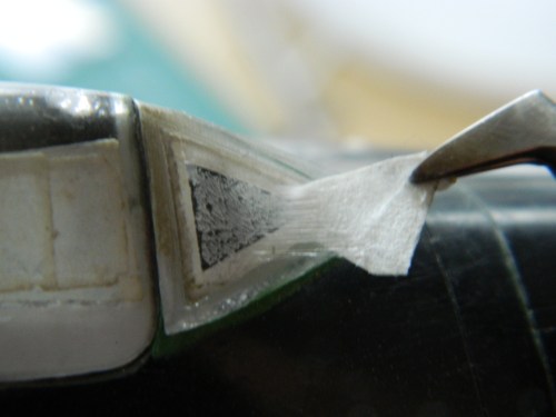 With the masking tape removed, a cotton swab dipped in lighter fluid dissolved and removed the stuck on adhesive left behind: