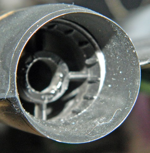 When I started to add the inlet spikes to the engine intakes, I was only half successful at first. The port (or left, if I’m not trying to impress) spike went in fine (or so I thought at the time…later on I discovered it had drooped a little before the glue set…and now there isn’t any way to fix that, so the next spike would have to have the same, inaccurate, droop). The starboard (or right, if I’m still trying to impress), however, managed to dismount its connecting point as I was pushing it into place. I thought I had that assembly well-glued, reality indicated otherwise. Aside from the obvious, the part that came completely disconnected is inside the nacelle: