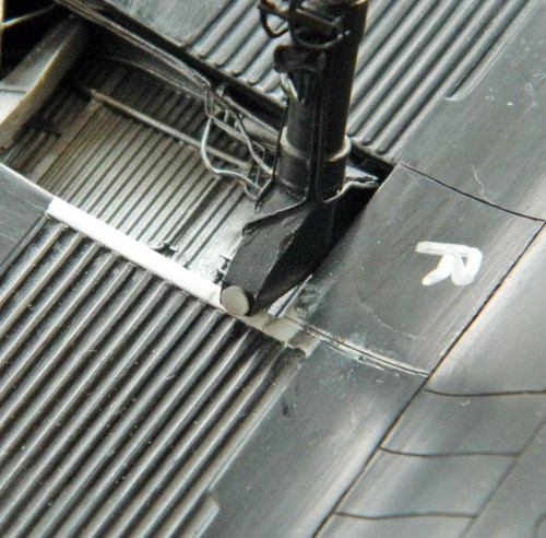 Then I needed to attach the control surfaces in the slightly-drooped position. Doing this offers more visual stimulation but I really dislike the task itself (frankly, I’d rather scribe lines) (spits). Once I had the inner control surfaces in place, the gaps on the lower sides had to be filled; I used styrene to do that: