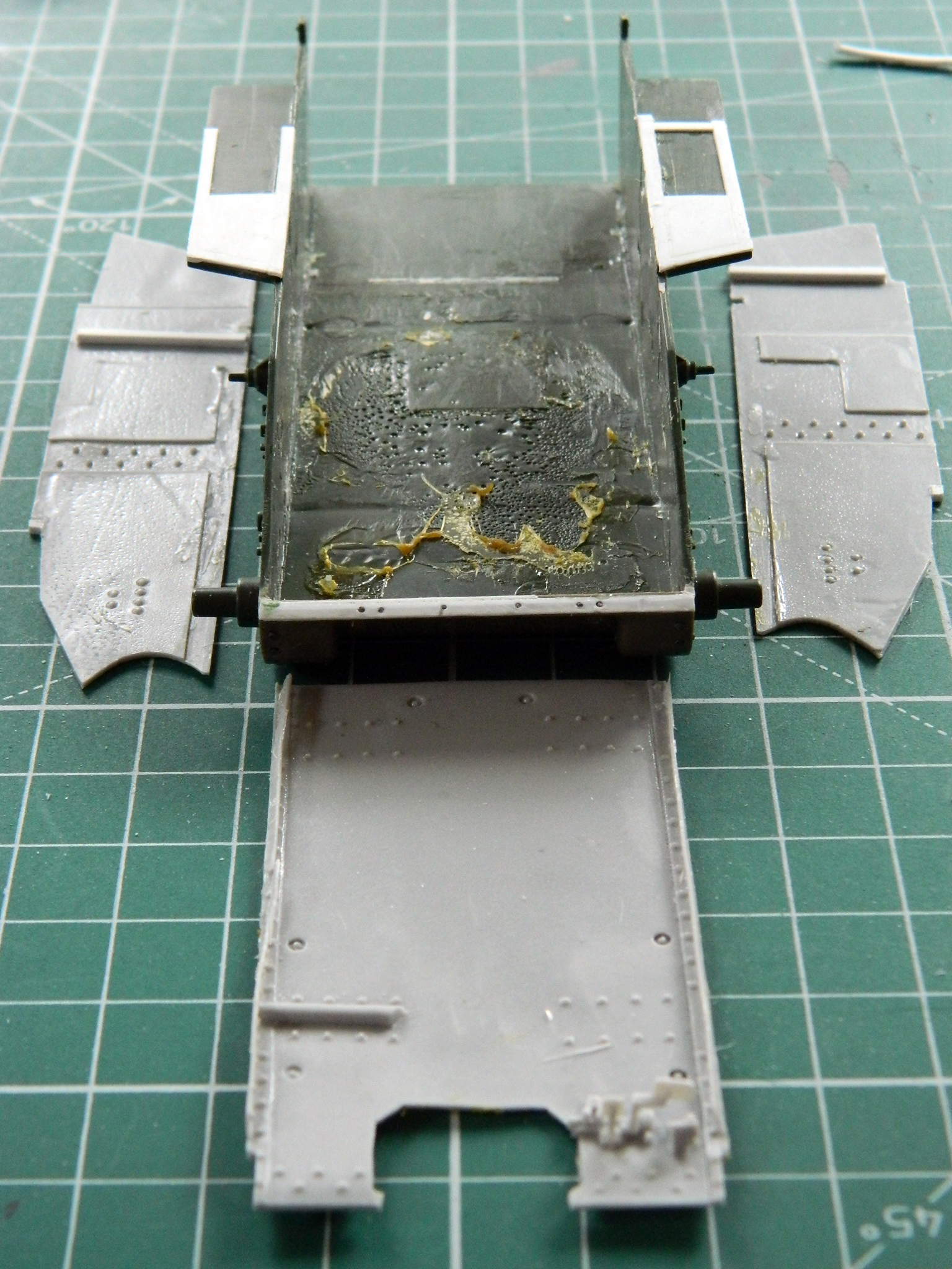As more parts were cleaned up, pouring stubs removed, and parts dry-fitted, I came to the realization that somehow I managed to put the floor and walls in the wrong position; they were too far forward. The first step to fixing that was removing all three parts and then reattaching them correctly: