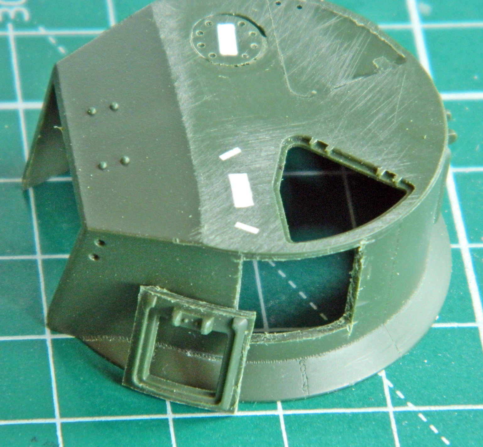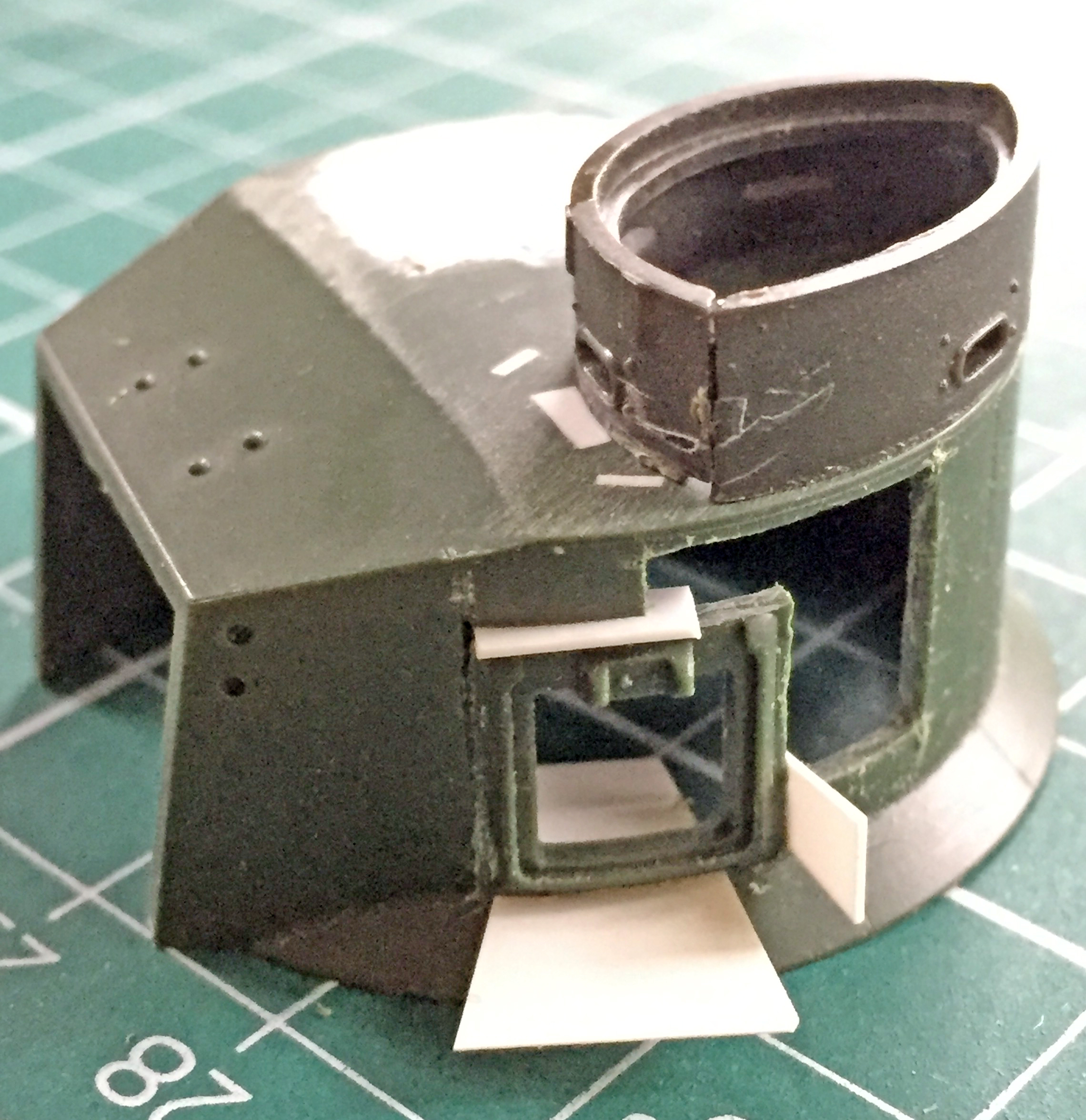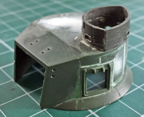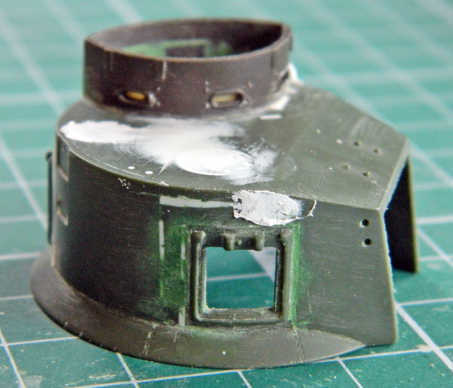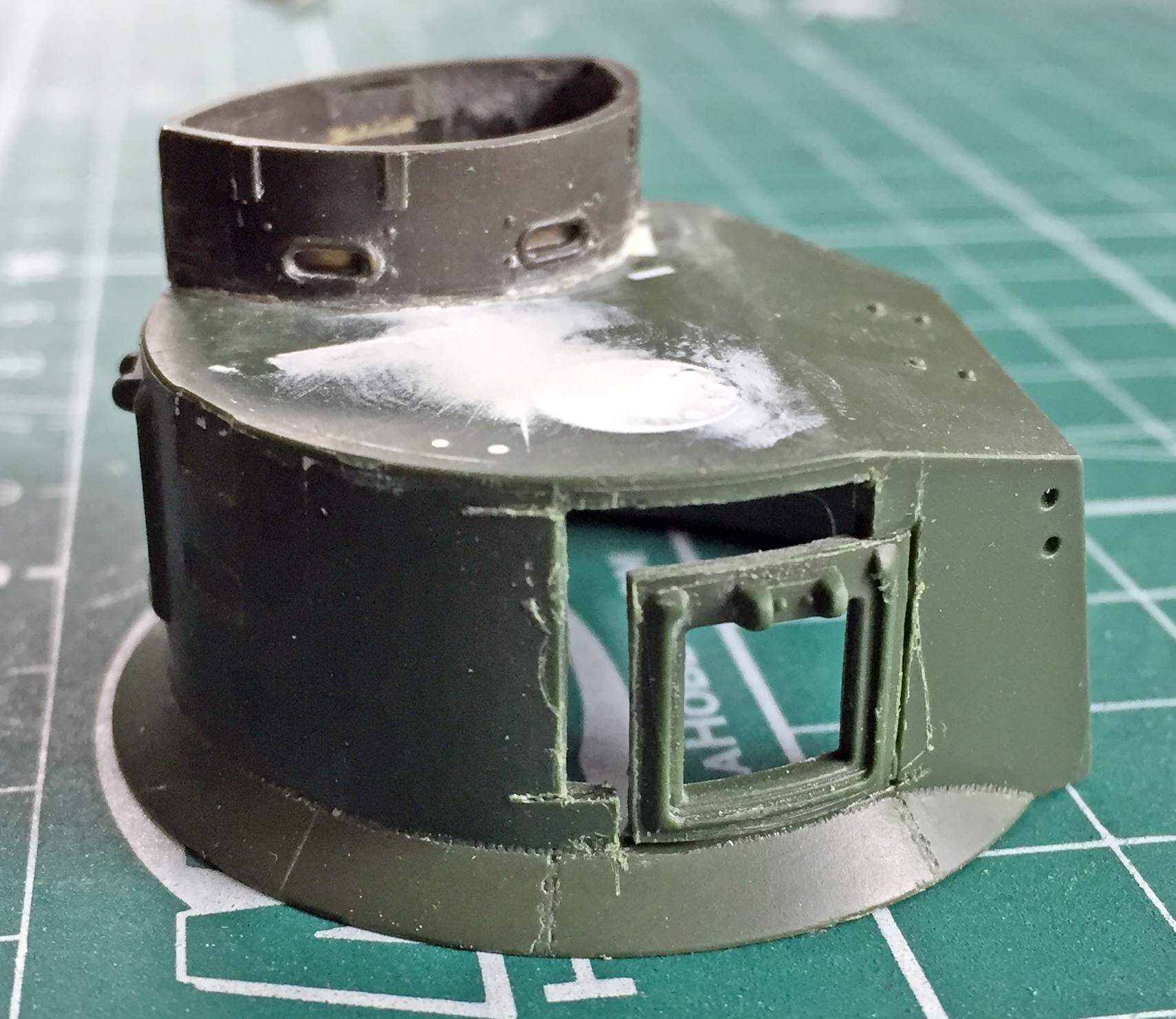 With the cupola added, the top smooth, and the gaps around the repositioned pistol port puttied and sanded, that all looks like this: