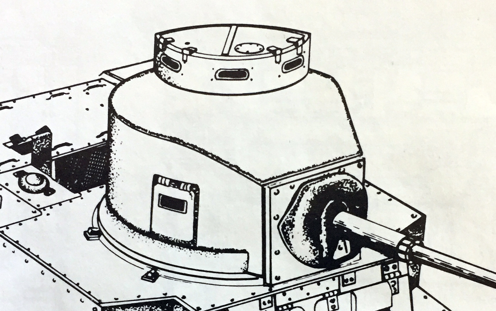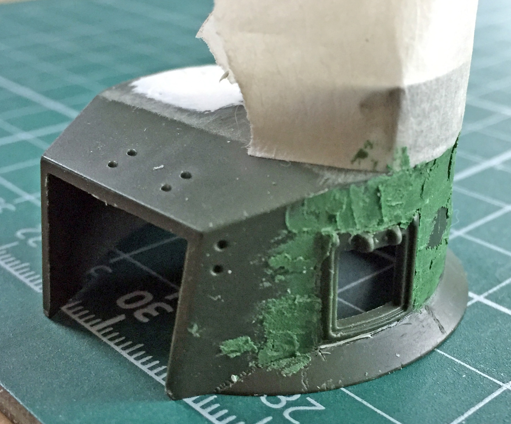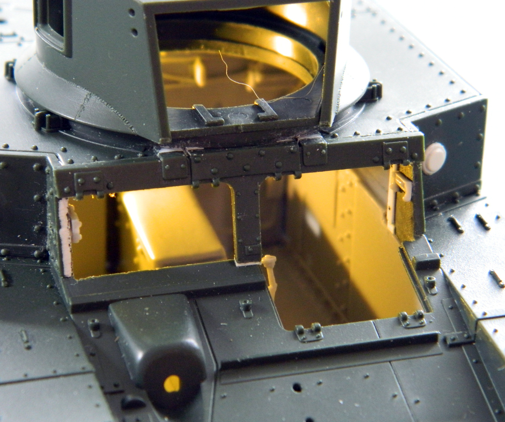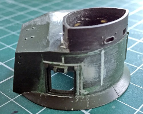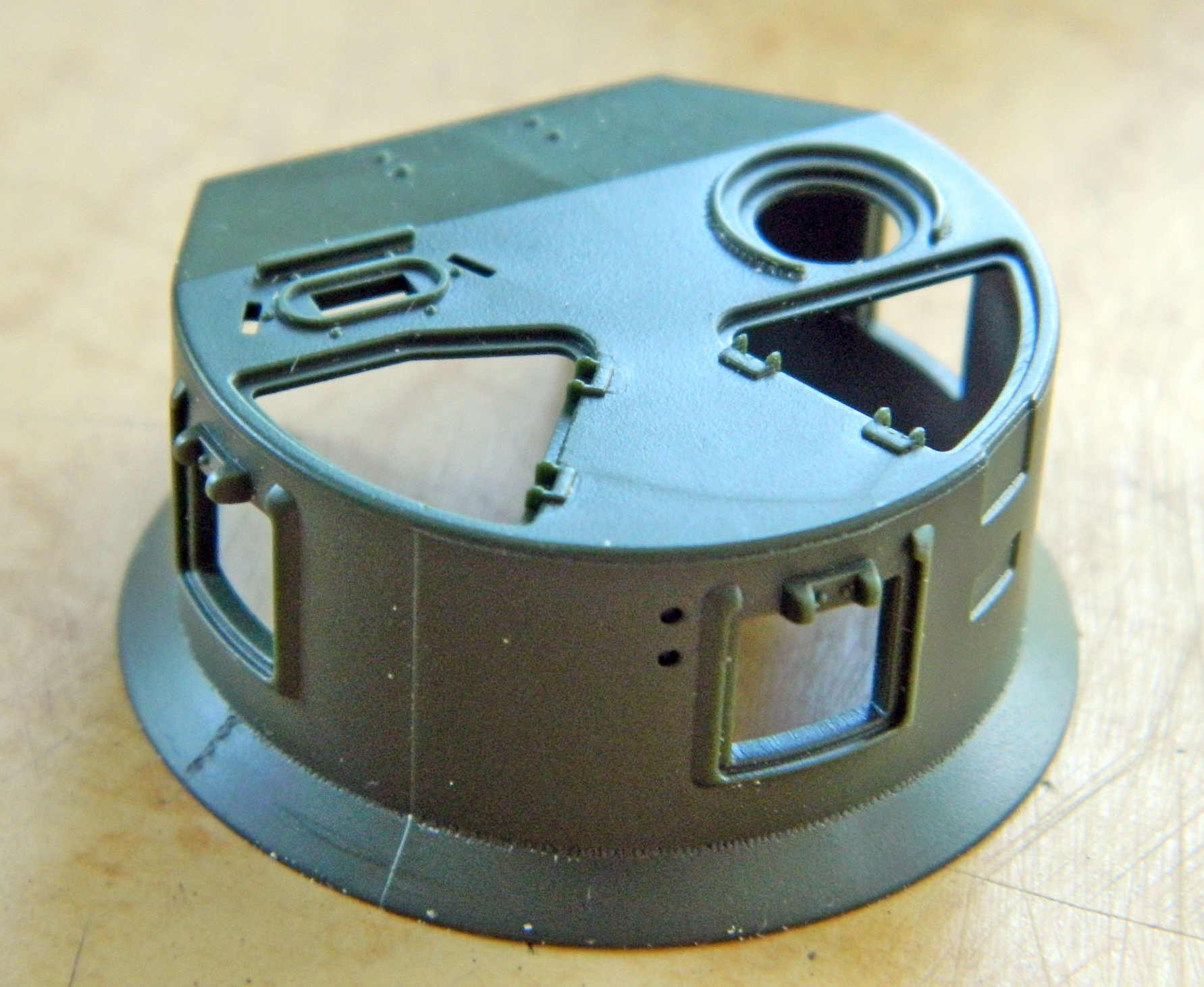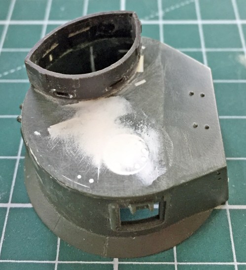 With the cupola added, the top smooth, and the gaps around the repositioned pistol port puttied and sanded, that all looks like this: