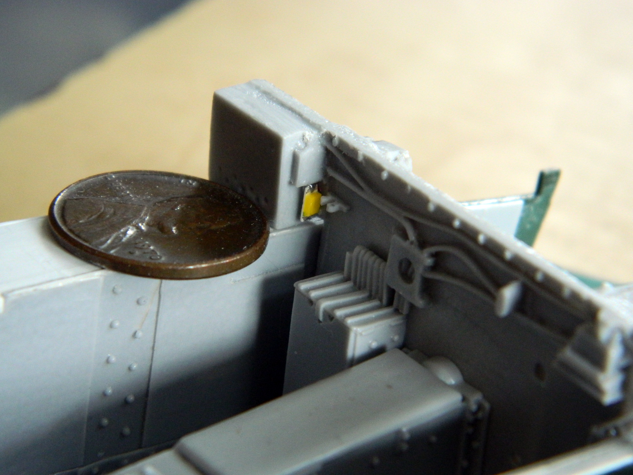 One of the things I want to do with this build is to add a light to the interior. The battery and switch will go into the space where the engine would be, and the LED is going here, not finding any references as to where, or even if, the actual tank had a light, I put it at the upper right side rear bulkhead. That little yellow rectangle is the LED; I had the choice between cool white and warm white and I went with the warm white to replicate a 1940 light bulb:
