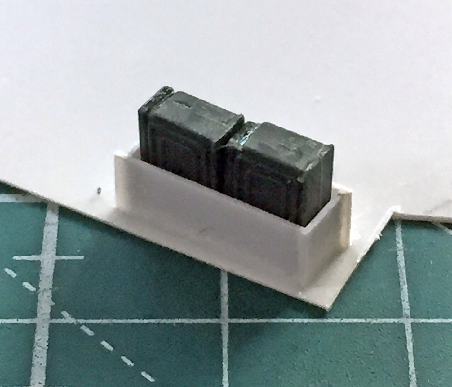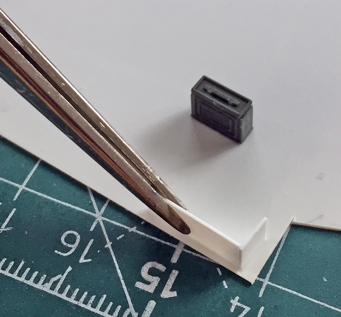 The tray on the floor next to the co-driver’s seat held two .30 caliber (7.62mm) ammo cans on end. The resin part was too small for the cans I’ll be using, so I made one from .015″ (.381mm) styrene scrap: