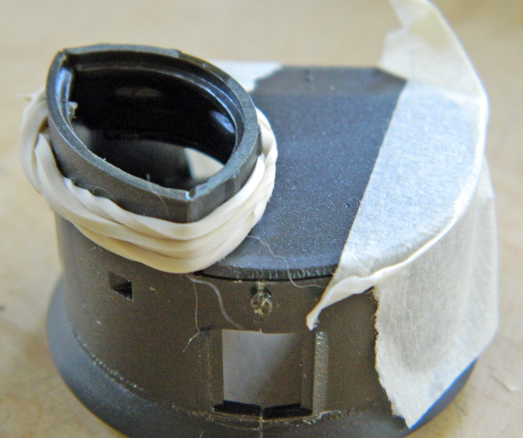 So the first step is to assemble the Tamiya turret. The mistake I made, though, was using a rubber band to hold the cupola sides together. The rubber band wicked the glue to places I didn’t want glue to be:
