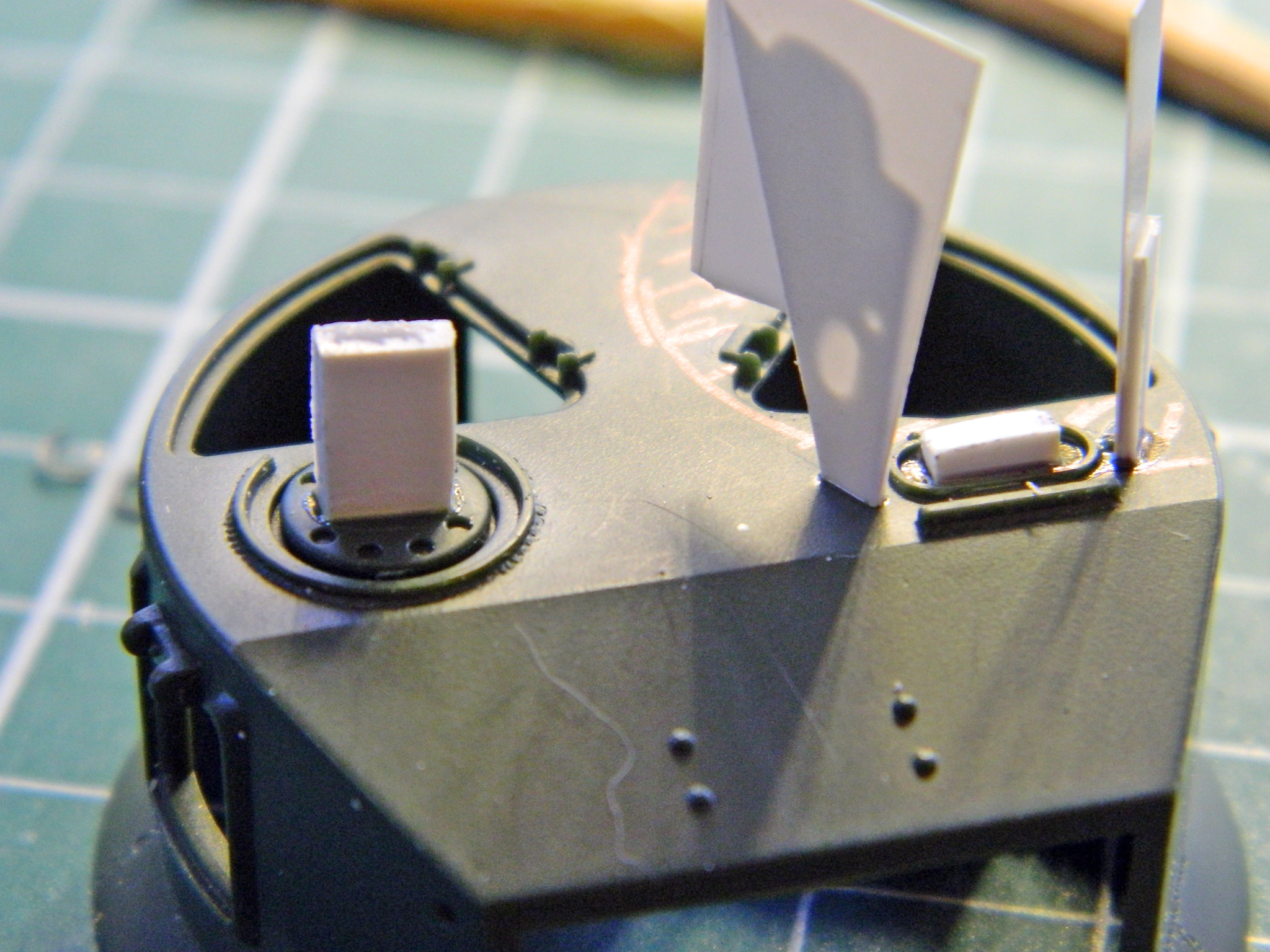 Scrap styrene does the deed for periscope locations and the loader’s hatch fills the hole it’s perfectly sized to fill: