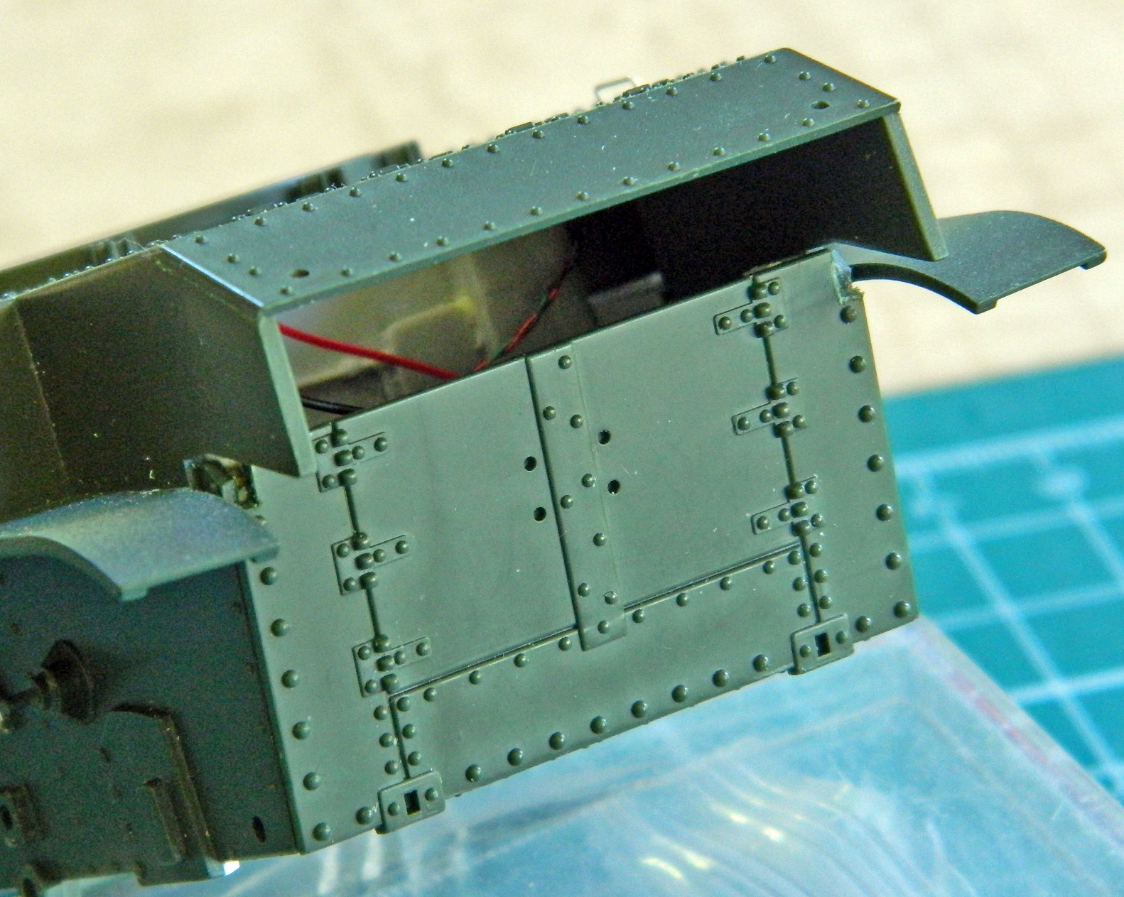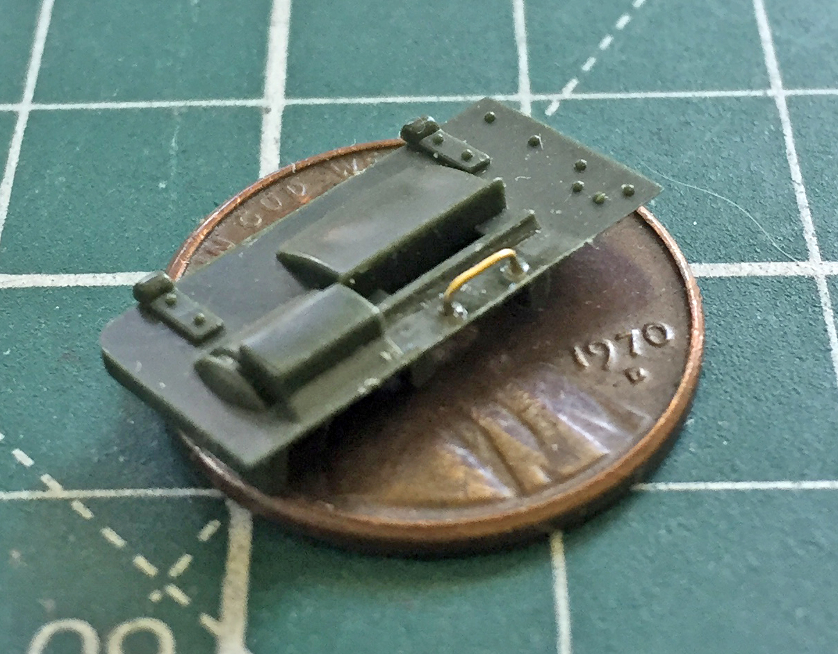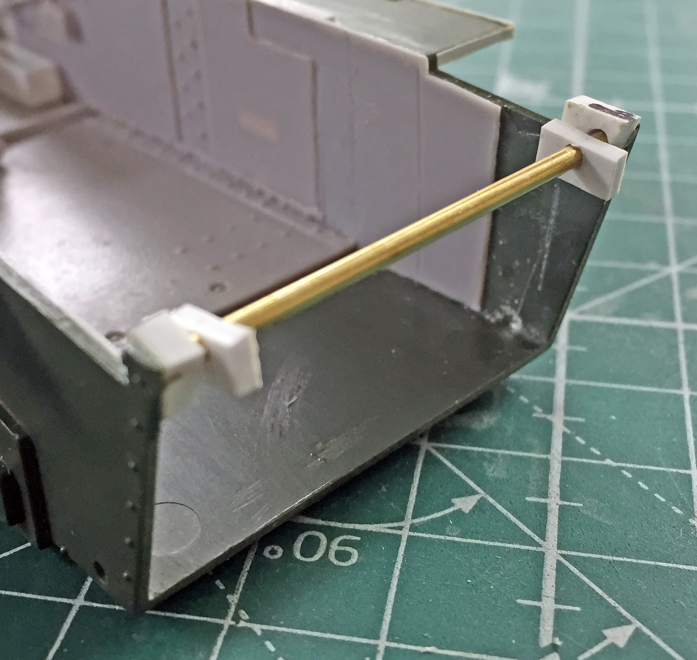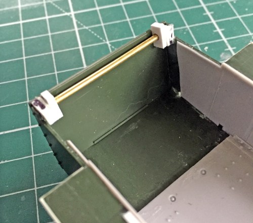 I used a piece of 1/16″ (1.58mm) copper tubing as my hinge pin. .080″ (2.032mm) styrene scraps were used as the tubing sockets and were drilled to accept the ends of the tubing and glued to the sides of the hull. I drilled out .060″ (1.524mm) styrene scraps, slid them over the tubing, and then glued them to the rear plate: