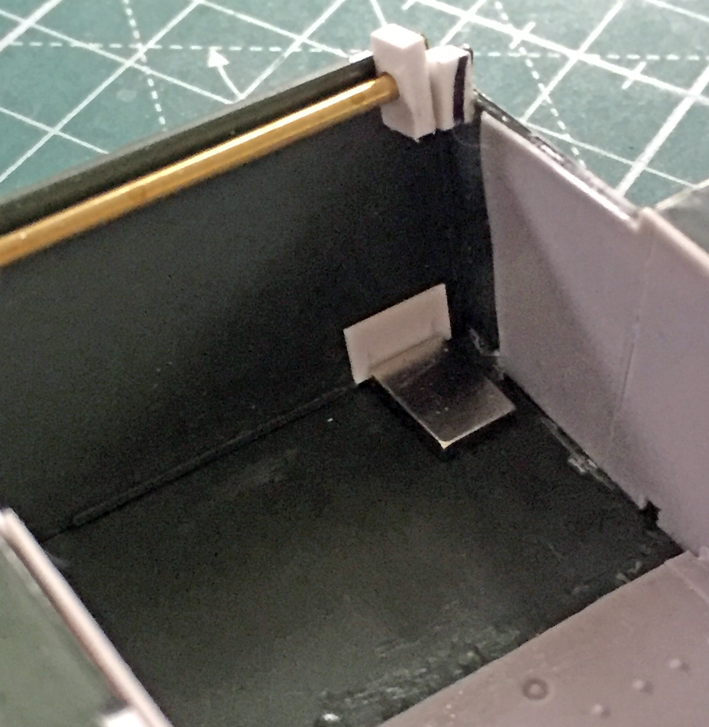 And I added .020″ (.508mm) styrene to both sides of the suspension mount (and I draw your attention to the mounts just inboard of the suspension mounts where a clamp slipped off and snapped off both mounting pins…which I will have to fix):