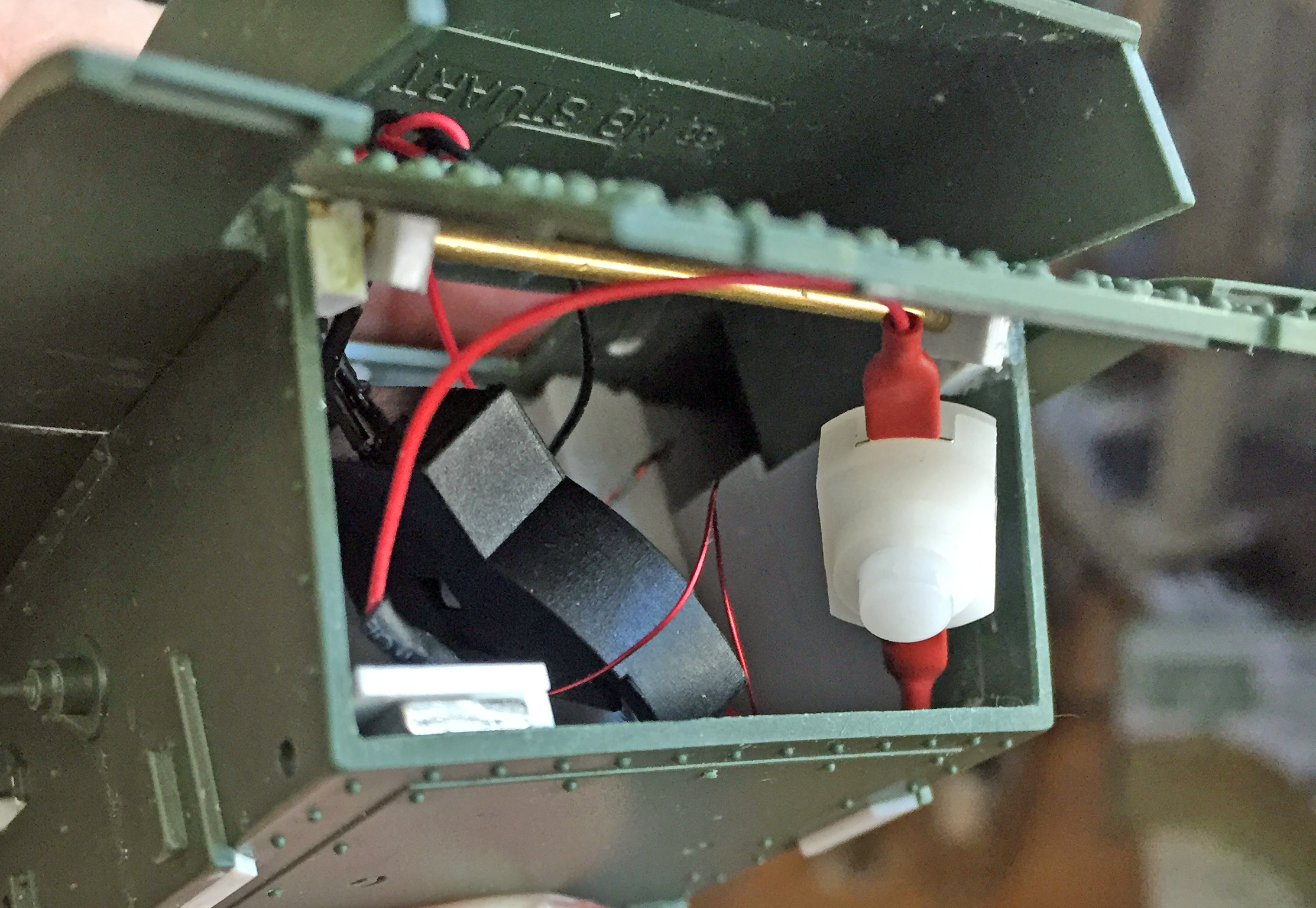 Another feature I wanted to add to this build is a LED inside the fighting compartment. I added that to the firewall and ran the wires into the area where the engine would go. The leads for the LED and battery/switch assembly were ample. They were ample enough to pretty much fill the damned space with just wires. So the wires were trimmed, soldered, and insulated: