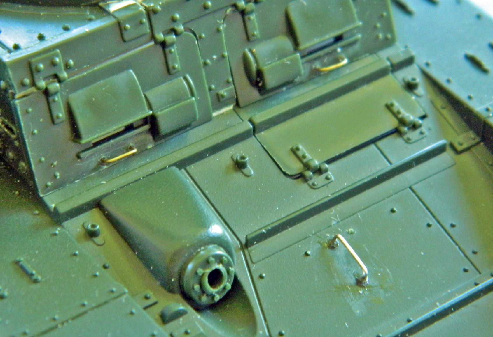 The driver’s lower hatch needed a little detailing. The top of it (to the right of the photo) is hinged so that it has the room to open and it also has a leather-covered pad (probably to keep the driver’s teeth inside his mouth). I scribed a line where the hinge should be and then used .010″ (.254mm) scrap and some stretched sprue to replicate the hinge (even though the hinged area has to be folded up to open the hatch, it’s always shown extended in my reference photos). I don’t know what the inner panel on the main body of the hatch is for, but I’ve seen it in references, so I used .010″ (.254mm) scrap to replicate it: