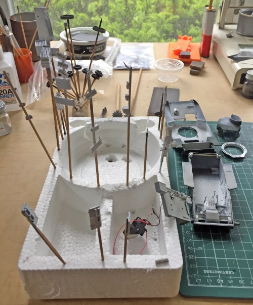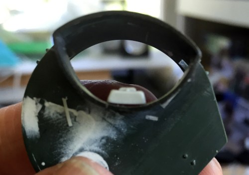At this point something that had been nagging at me, the ol’ “Have you forgotten something,” showed that yes…I had forgotten something. Inside the turret cupola are the armored covers for the direct-vision slots and I had neglected to put those in. Wonderful. I stripped out the steel and white paints (and interestingly, as I went after the acrylic paint with denatured alcohol, I discovered that it also lifted the enamel steel paint as well…so that requires further experimentation also, since turpentine STINKS) so that the resin parts would glue in securely.