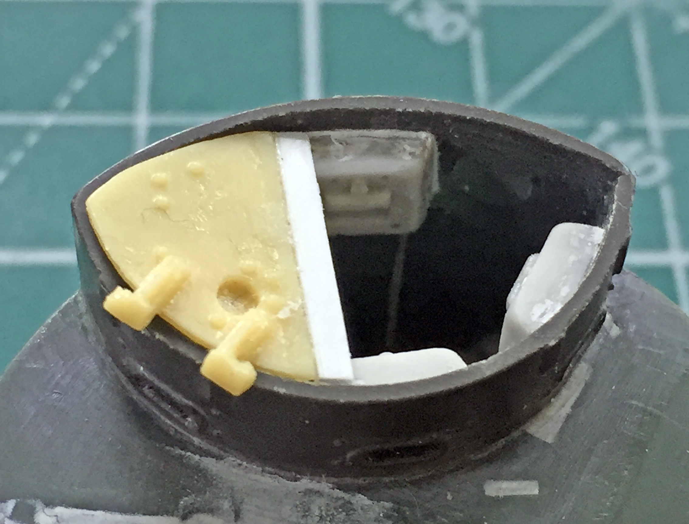 The cupola is curved, as are the armored covers. However, the radius of the arcs between one side of the cupola and the other are different. The resin armored covers were fit to the rear of the cupola, not the front. Note the gap under the center of the cover (if you can…not the best photo of it, just the best I could get):