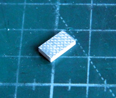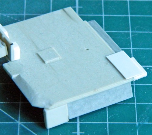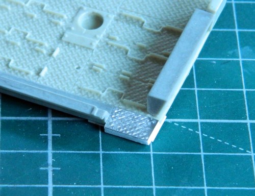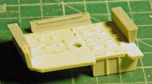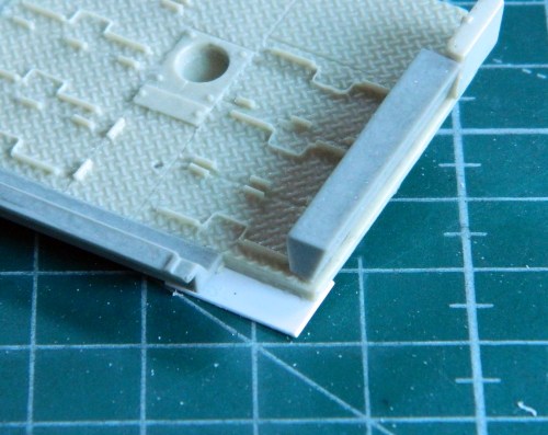 I added a section of .020″ (.508mm) scrap to provide more gluing surface, then glued the new floor piece into place. And though not evident in these photos, I also thinned the edge of the resin floor where the actual floors of these sections just sort of hangs out: