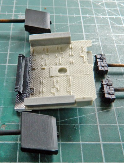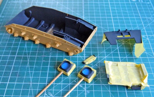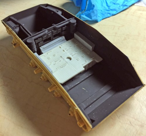 I started assembling the raised floor (under which the actual tank has water-jacketed ammo storage). With the bulkhead just dry-fitted, I placed the floor and added the parts needed, using the hull as my assembly jig: