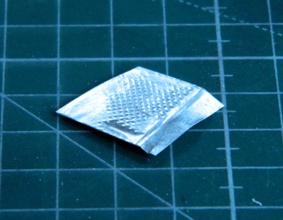 Since I don’t have any scale diamond tread plate (something I should rectify), I copied a section of floor from Academy’s M3 using heavier gauge aluminum sheet and supergluing a .060″ (1.524mm) styrene section to the aluminum and then trimmed it: