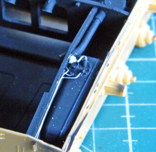 One of the (several, I think) things I’d wanted to add before painting and forgot to do was the plumbing around the tops of the fuel tanks, so I added it: