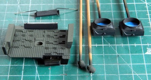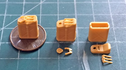 Each of the five-gallon cans has six parts (and were I crazy enough, the locking lever has its PE equivalent…be seeing as I’m merely colorful and not crazy [snicker], I used the plastic part instead):